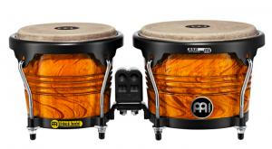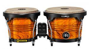 Paire bongos 6" 3/4 & 8", série Designer, fûts hévéa, peaux buffle sélectionnées, système de suspension Free Ride, crochets 8 mm, cercles arrondis SSR 2 mm, accastillage noir, clé en L fournie, Amber Flame brillant