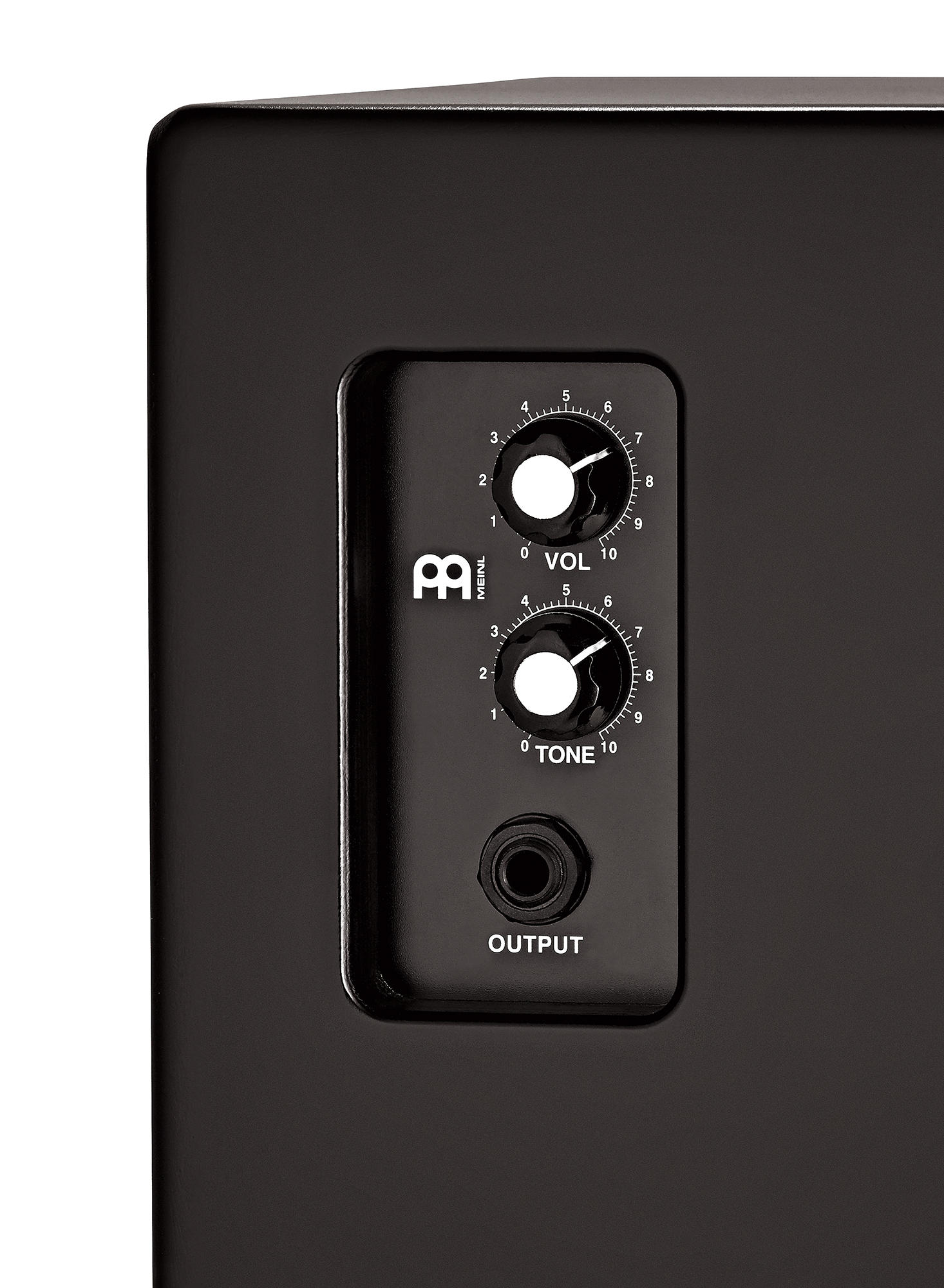 Cajon Pré-amplifié Meinl, façade Makah-burl, corps en bouleau baltique, trois micros piezo (deux pour les sons de caisse claires, un pour les basses), réglages des tonalités, cordes snares, finition noir mat 29.84cm x 50.16cm x 30.48cm
