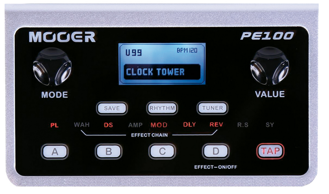 Pédalier multi-effets PE100, 6 blocs d'effet comprenant 39 types d'effets, 98 presets usine et 99 presets utilisateur, noir