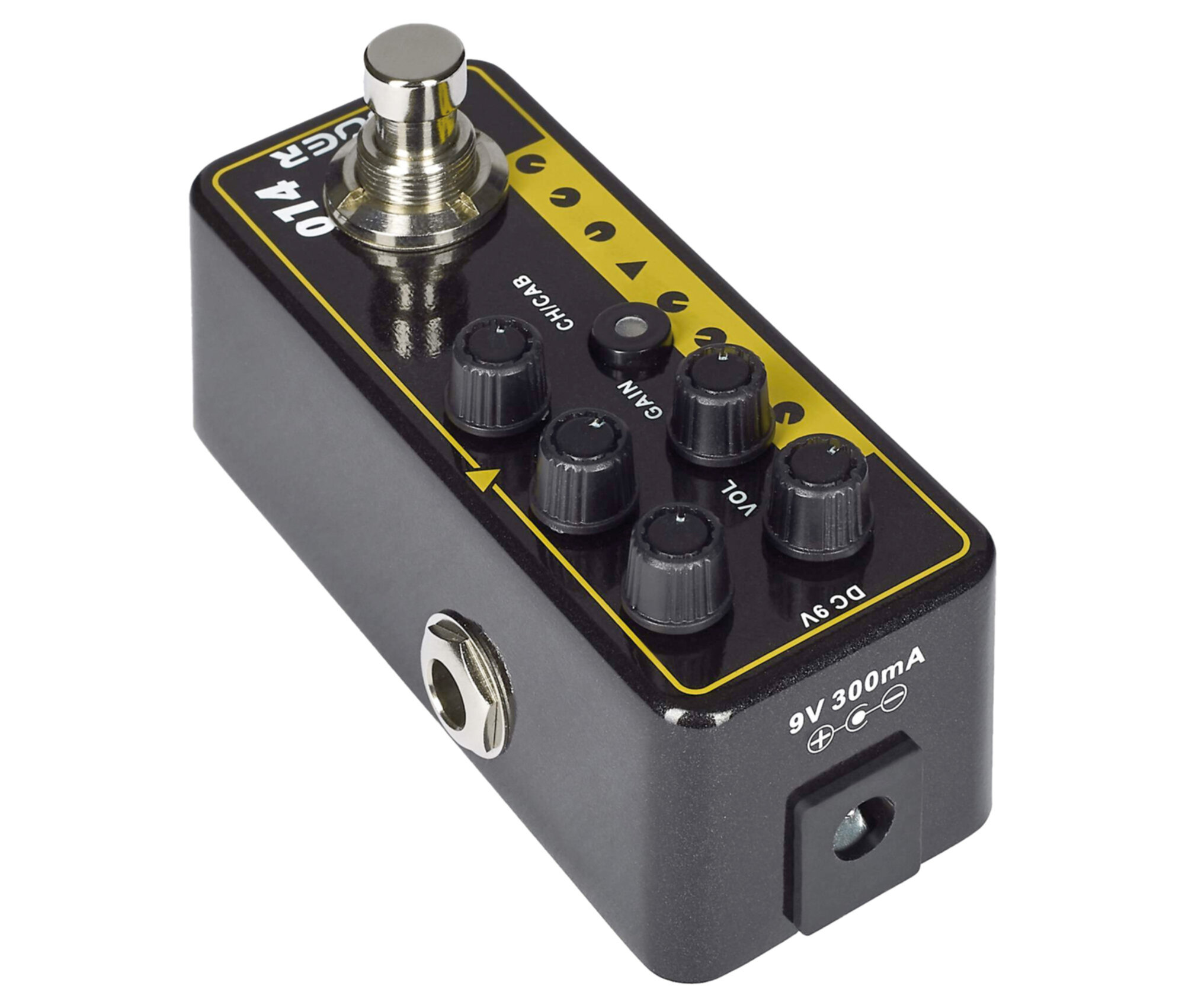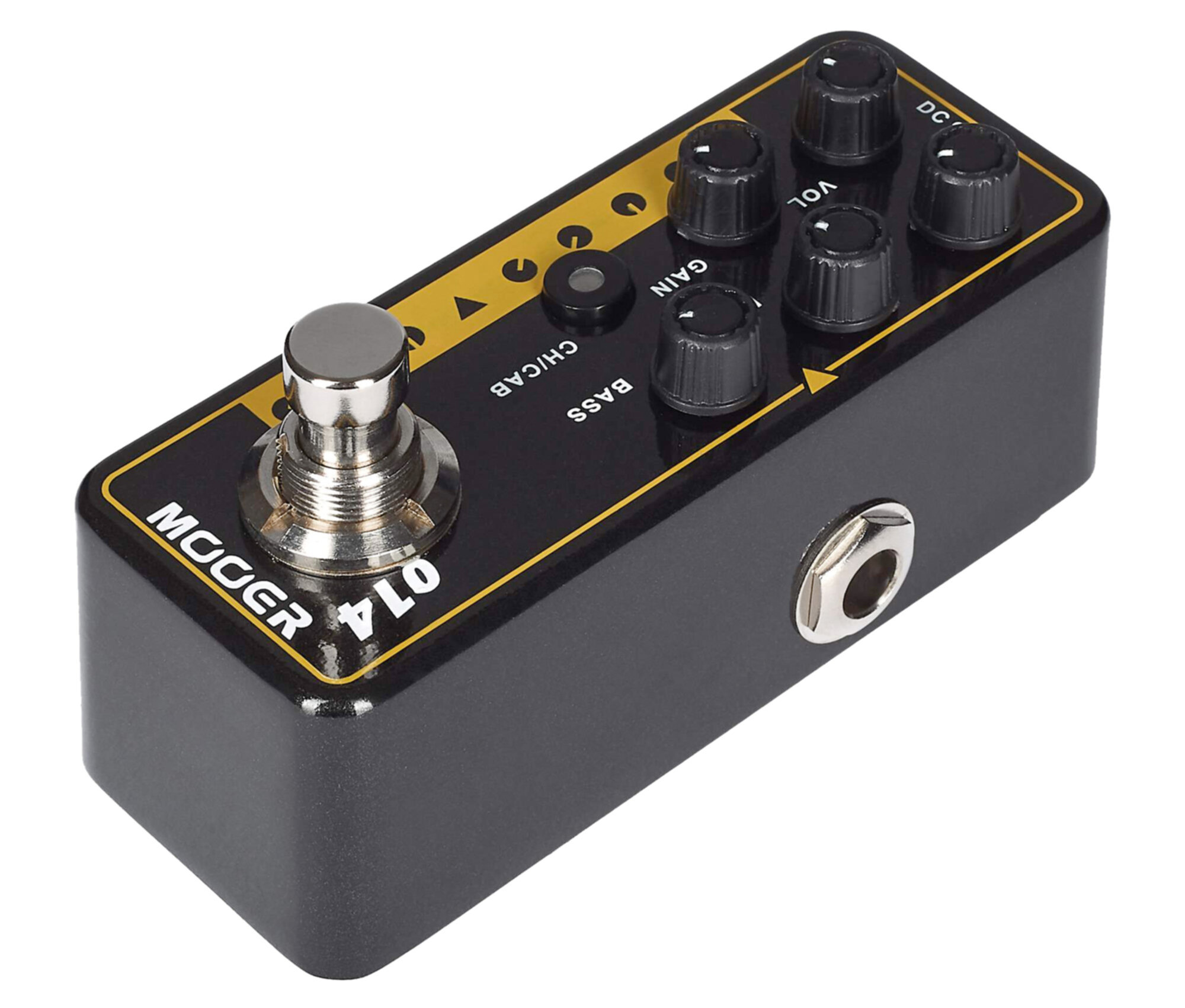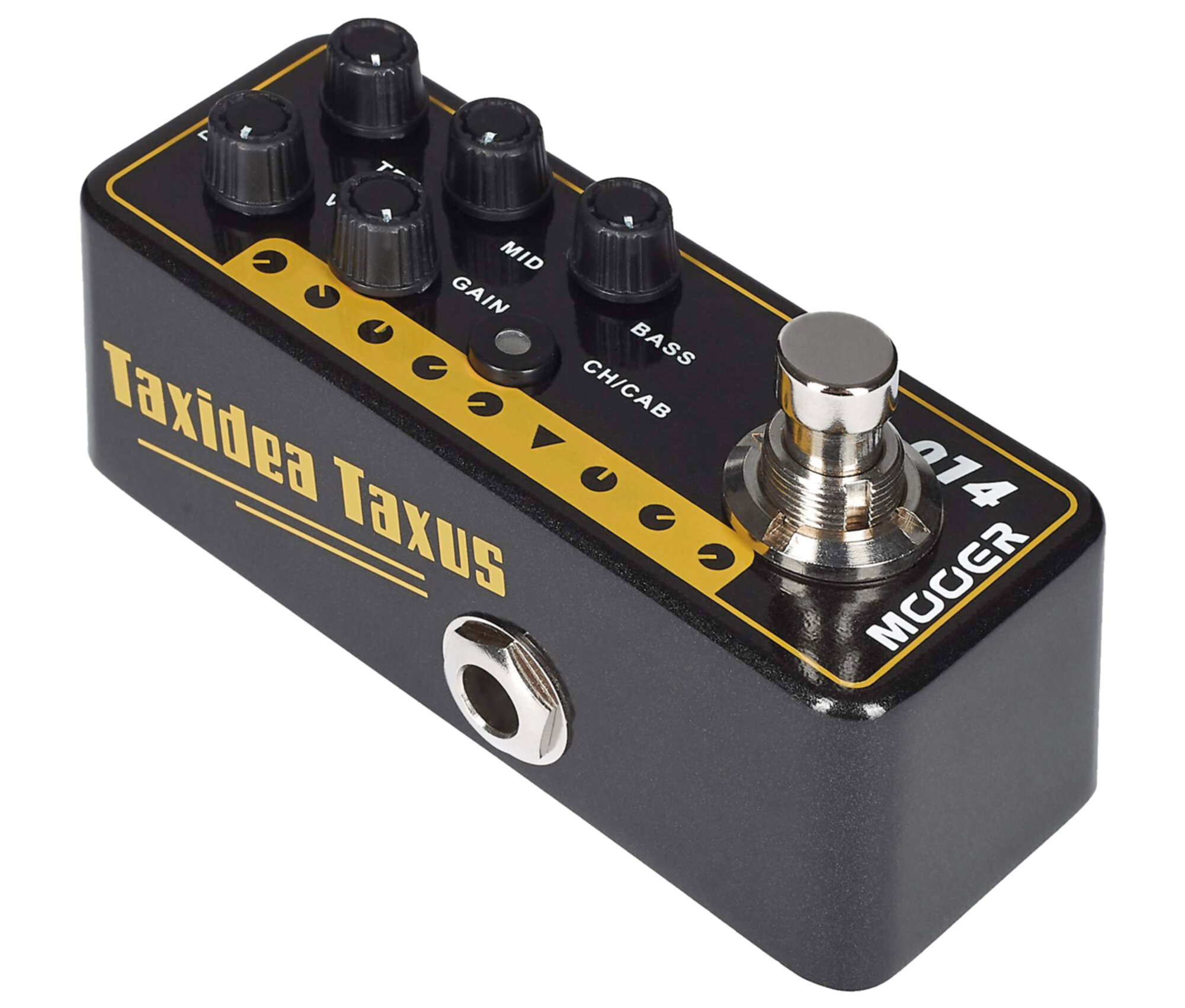 Pédale TAXIDEA TAXUS, préampli numérique type US combo, deux canaux, EQ 3 bandes par canal, noir et jaune