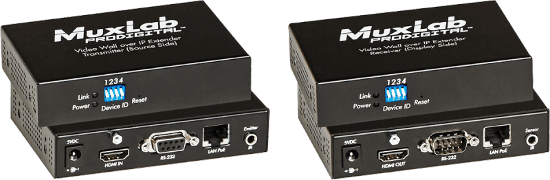 Le kit émetteur/récepteur HDMI sur IP pour mur vidéo 500754 a été spécialement développé pour concevoir des murs d'image configurables, pouvant supporter une centaine d'écrans.