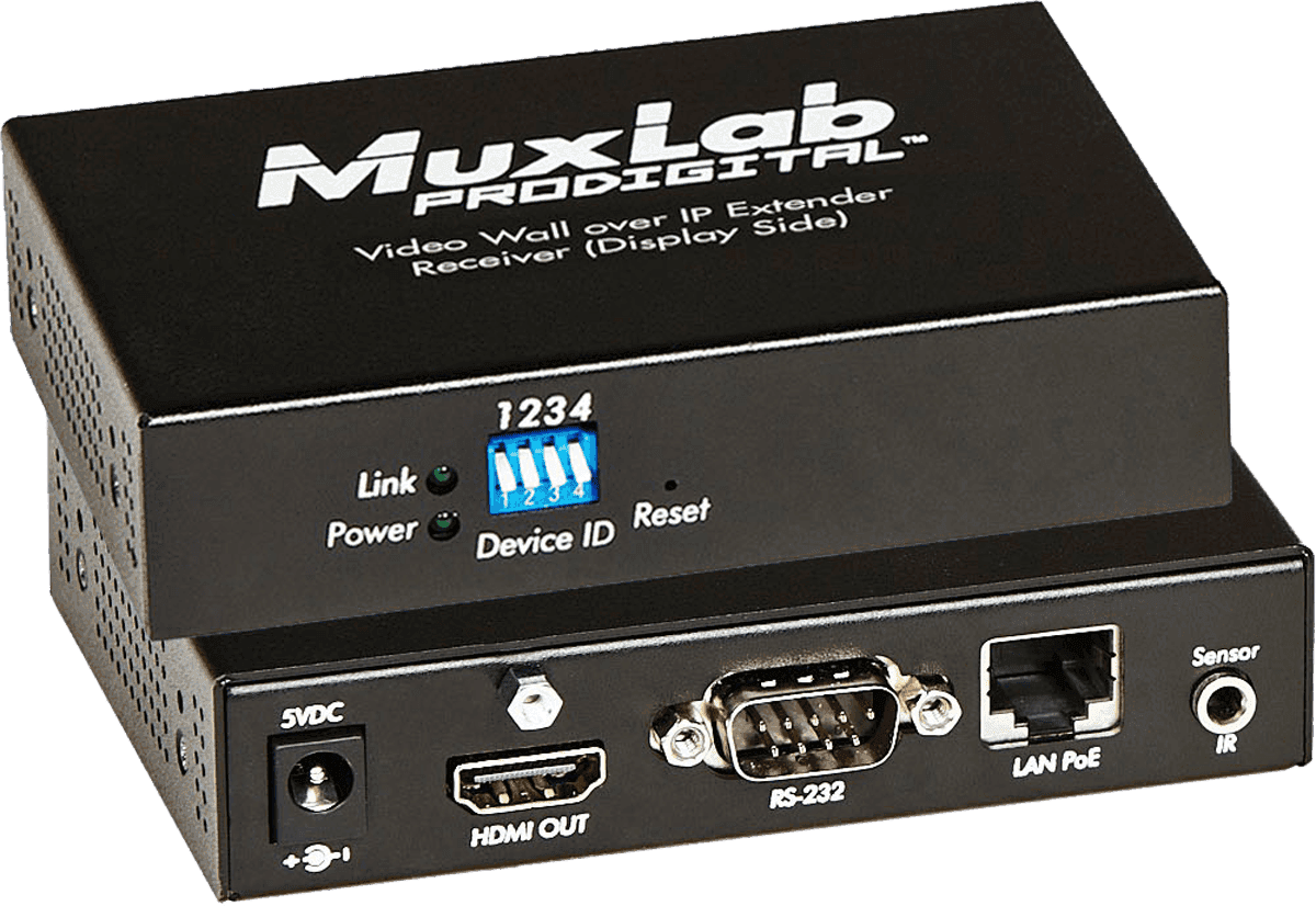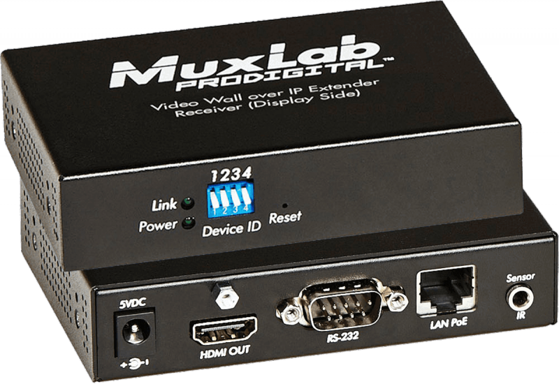 Supportant des résolutions allant jusqu'à 1080p et portant jusqu'à 100m grâce à un câble RJ45 Cat5e/6, le récepteur est connecté au support en HDMI, et à un switch réseau (POE ou non) couplé à un contrôleur réseau 500811 vendus séparément afin de simplifier la configuration et le contrôle. Le contrôleur permet la configuration et le contrôle du mur vidéo via un support mobile, tel qu'une tablette ou un smartphone.