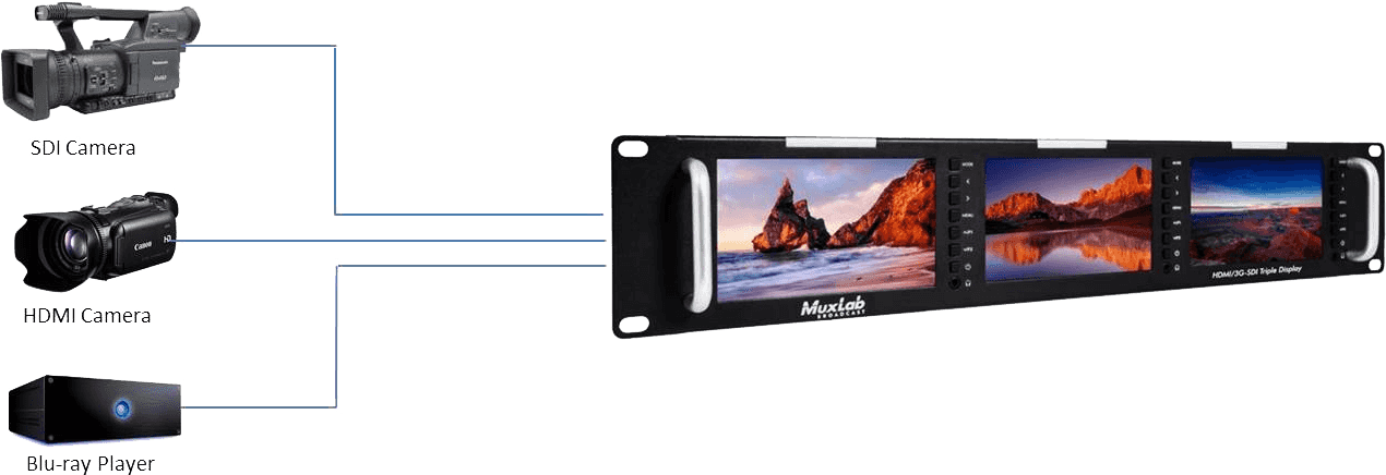 Ce moniteur vidéo multiples écrans prend en charge l'entrée et la sortie en boucle des signaux HDMI jusqu'à 1080p/60, des signaux SDI jusqu'à 3G-SDI et des signaux CVBS avec audio.