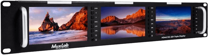 Le 500840 est composé de trois écrans LCD TFT indépendants de 5 pouces chacun (résolution 800x400 RVB). Il est facile d'utilisation grâce à son format rack 19" 2 unités.