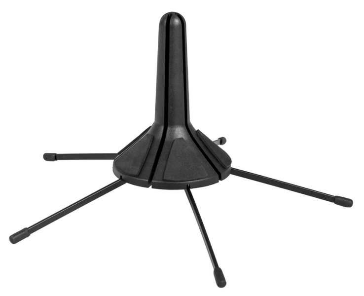 Support trompette, cône avec revêtement protecteur, pieds repliables, design compact (18 cm). Une fois replié, le support se loge dans le pavillon de l'instrument pour un transport aisé.