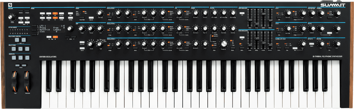 Grâce à son architecture multitimbrale, en deux parties, le Summit met la puissance de deux Peaks à portée de main, ce qui permet de scinder ou de superposer deux patchs complètement indépendants sur le clavier, ou de les basculer à la volée. Mais ce ne sont pas seulement deux Peaks qui ont fusionné : l’ajout de filtres doublés par partie, les commandes considérablement étendues du panneau avant, l’entrée audio externe, pour ne citer qu’elles, donnent au Summit une toute nouvelle dimension en termes de son et de flux de travail.