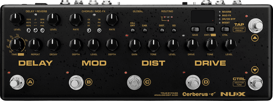 Ce pédalier regroupe 4 types d'effets - Drive, Distorsion, Modulation, Délai - disposant chacun de leurs réglages et paramètres propres afin d'obtenir le son que vous recherchez. Subtil mélange d'effets analogiques et numériques, le Cerberus embarque une Overdrive et une Distorsion analogiques true-bypass, configurable selon 4 schémas de routage différents, comprenant 2 câblages en série et 2 en parallèle.