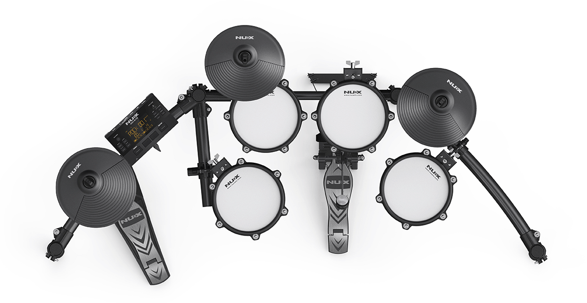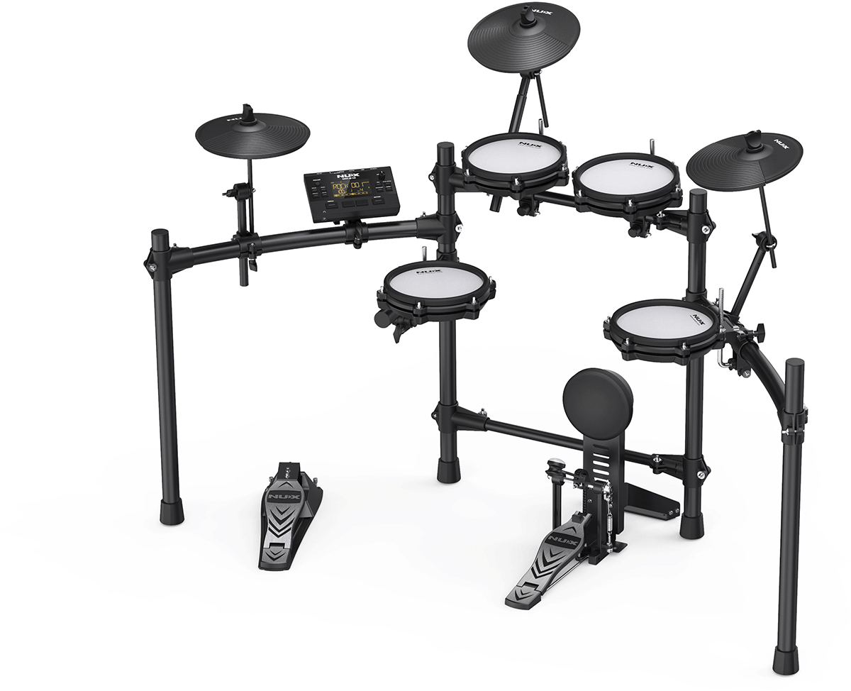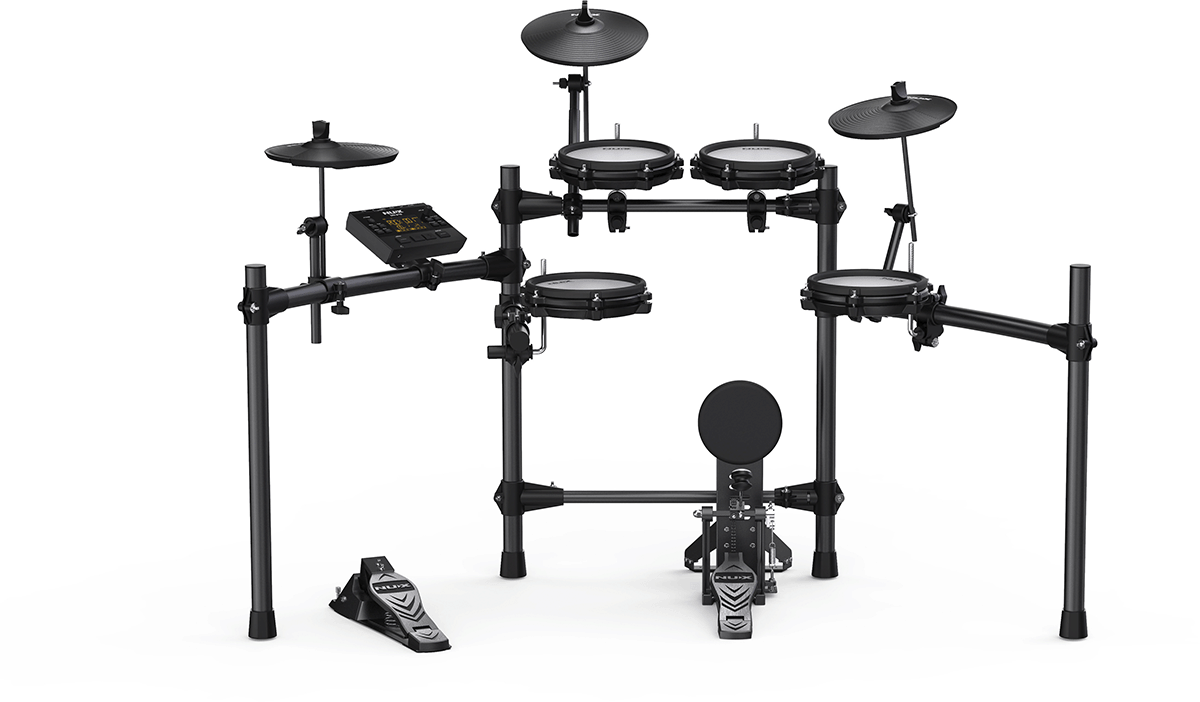 - Accessoires inclus : Pédale grosse caisse, Pédale hi-hat, Baguettes, Adaptateur AC, Câble multitrigger