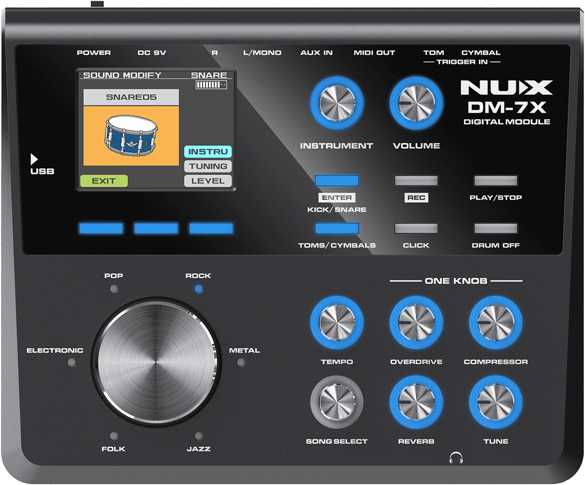 Le module de la DM7-X regorge d'innovations et de fonctions, propose 30 kits de studio échantillonnés avec précision et une bibliothèque de sons personnalisable, ce qui permet d'obtenir les sons de batterie les plus réalistes et les plus expressifs. Le module autorise l’enregistrement et plusieurs modes d'entraînement pour vous aider dans votre apprentissage ou tout simplement pour peaufiner votre jeu déjà proche de l’excellence. Enfin, pas moins de 4 effets sont disponibles pour personnaliser encore plus votre signature sonore et travailler votre créativité. Côté connectique, le module regorge de possibilité avec 2 entrées trigger permettant d’ajouter un pad ou une cymbale supplémentaire, une sortie Midi, une entrée auxiliaire, une sortie casque et 2 sorties audio.