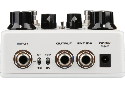 L’Ace of Tone propose bien plus que les deux pédales MorningStar et TubeMan réunies ! Le routage interne conçu permet de choisir l’ordre de votre signal en série : la section MorningStar attaquant la section TubeMan pour un boost en volume et en fréquences médiums / aigues, ou bien, la section TubeMan vers le MorningStar afin de saturer et donner encore plus de caractère au préampli type Breaker. En plus de cette flexibilité du signal des overdrives, la pédale permet de choisir entre un True Bypass ou Buffer bypass afin de préserver votre son suivant votre chainage. Un sélecteur d’alimentation permet de passer le voltage interne de la pédale de 9V à 18V afin d’apporter plus de dynamique et de headroom au rendu sonore général ! Enfin, une connexion jack footswitch permet de contrôler l’activation des sections d’overdrive à distance.