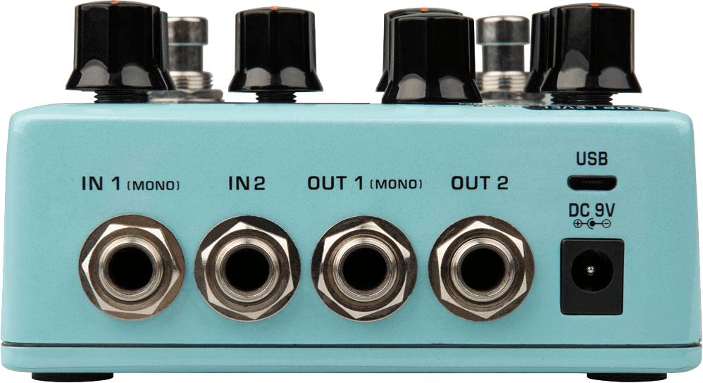 En plus de ses entrées/sorties stéréo, des deux circuits de délai et des cinq types de délai intégrés, la Duotime dispose d'un tap tempo, réglable au pied via le footswitch de droite pour régler la durée du délai à la volée.