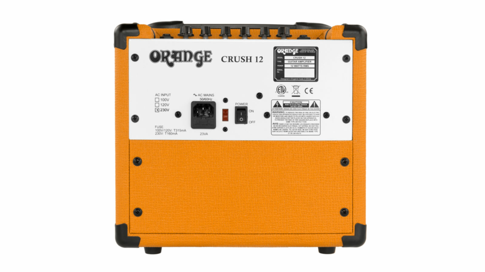 Le Crush 12 est un ampli d'une puissance de 12 Watts. Simple d'accès, ce combo propose un égaliseur 3 bandes et un bouton dédié à l'overdrive permettant l'exploration d'une multitude de sonorités. La prise casque permet également de connecter son ampli sur une interface audio et de disposer, grâce au système CabSim qui émule les sonorités d’un 4*12, du son « Orange ». Le grain de saturation est ce qui se fait de mieux dans sa catégorie. Il sonne bien, même à faible volume. Fiche Technique Type : Transistor Puissance : 12 Watts Baffle Haut-parleurs :1 x 6" Contrôles : Gain, Overdrive, Bass, Middle, Treble, Volume. Connexions: Entrées : Entrée instrument Aux-in Line out : Casque (jack 6,35) Line Out Divers Poids : 4,7 kg Dimensions (cm) : 30.5 × 29 x 17.5