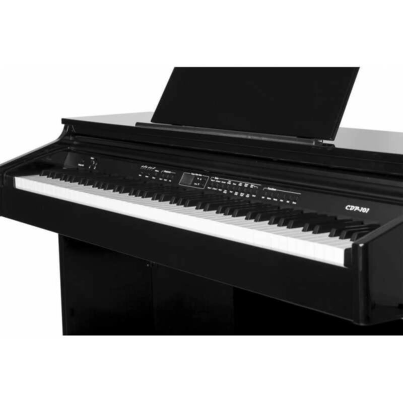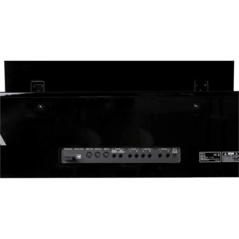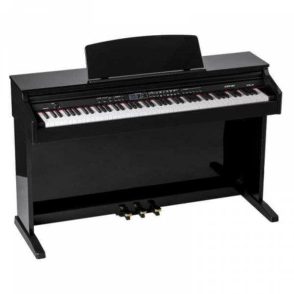 Piano numérique meuble, 88 touches lestées avec mécanisme à marteaux, frappe dynamique réglable, polyphonie 64 voix, 16 sons, 20 morceaux démo, transposition, enregistreur 2 pistes, métronome.