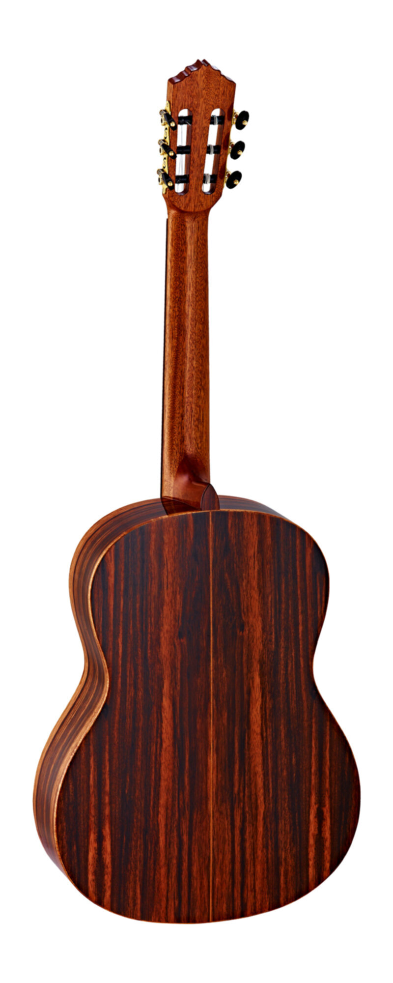 STRIPED SUITE, modèle Medium Neck, pan coupé, table épicéa massif, fond & éclisses ébène veiné AAA, binding acacia, purfling blanc, manche acajou (sillet 50 mm), touche (plate) & chevalet palissandre, chevalet 12 trous, rosace signature Ortega, truss rod double action, mécaniques laiton/noir satiné classe A, cordes Savarez, avec housse deluxe rembourée et courroie.