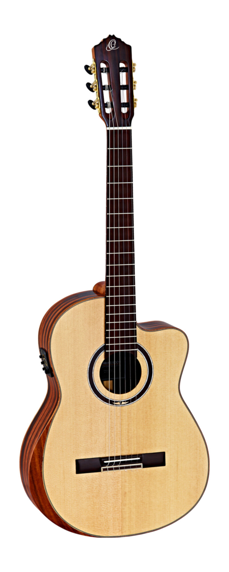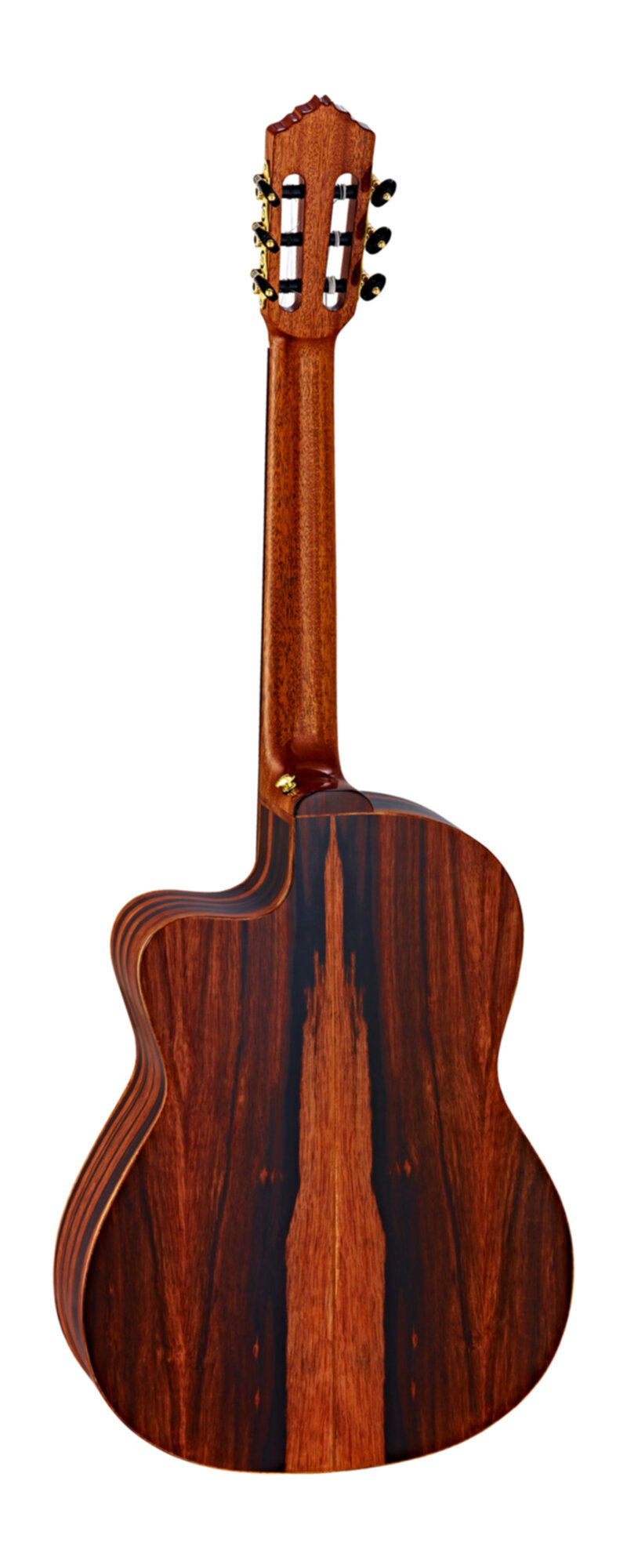 STRIPED SUITE C/E, modèle Slim Neck, pan coupé, EQ Ortega MagusPro, table épicéa massif, fond & éclisses ébène veiné AAA, binding acacia, purfling blanc, manche acajou (sillet 48 mm), touche (plate) & chevalet palissandre, chevalet 12 trous, rosace signature Ortega, truss rod double action, mécaniques laiton/noir satiné classe A, cordes Savarez, avec housse deluxe rembourrée et courroie.