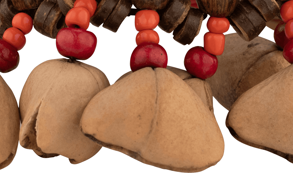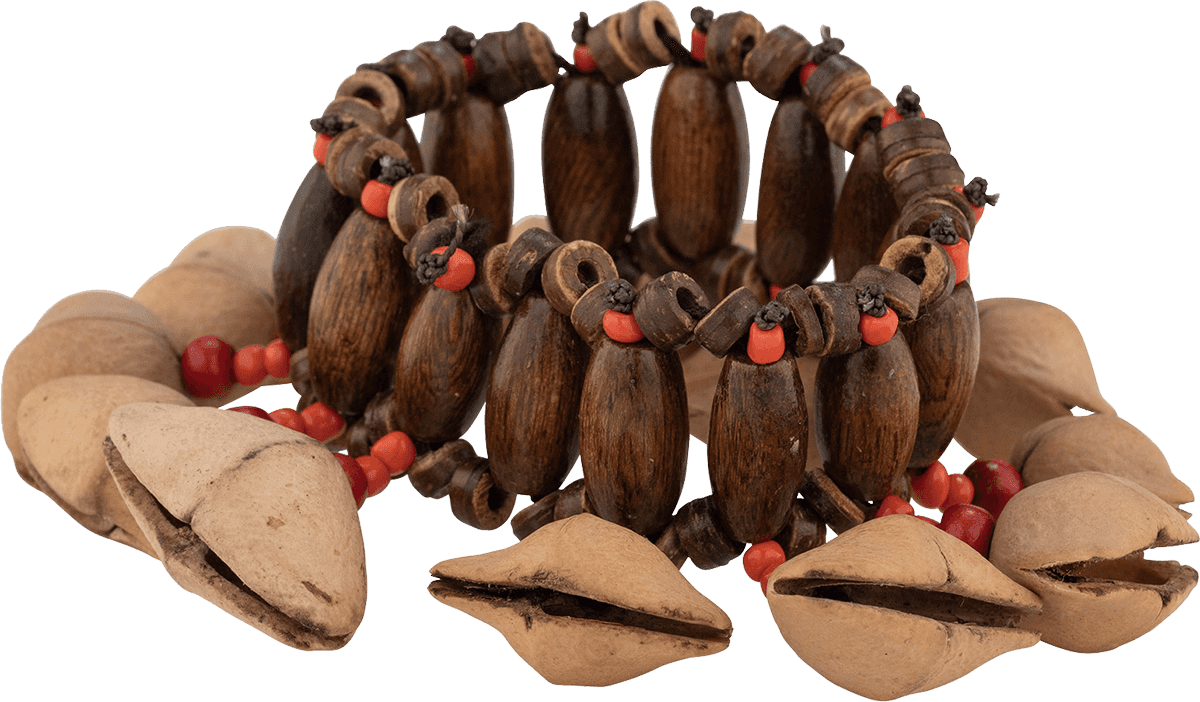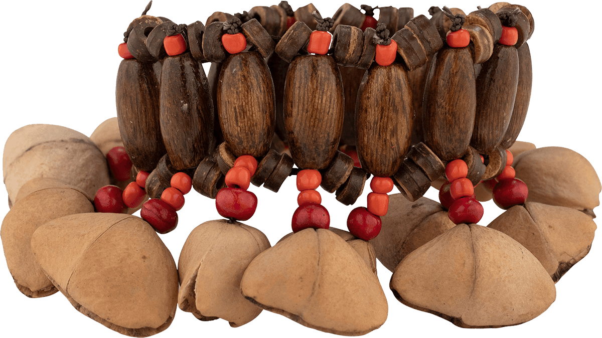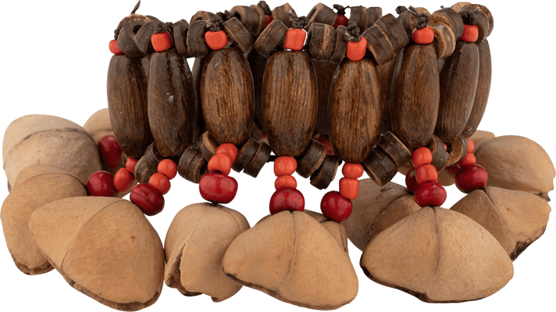 Le bracelet Kenari Nyt est composé de 14 noix Kenari individuelles sélectionnées et enfilées à la main. Ce bracelet permet de superposer des sons tout en jouant avec d'autres instruments comme un cajon, conga, bongo ou même une guitare.