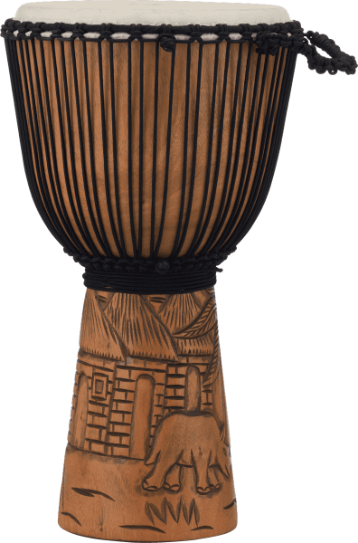 Ce djembé traditionnel est façonné à la main à partir d'une pièce massive en acajou et équipé d'une peau de chèvre naturelle. Il s'inscrit dans la plus pure tradition africaine, symbolisée par un décor sculpté représentant un village Malinké du Mali.