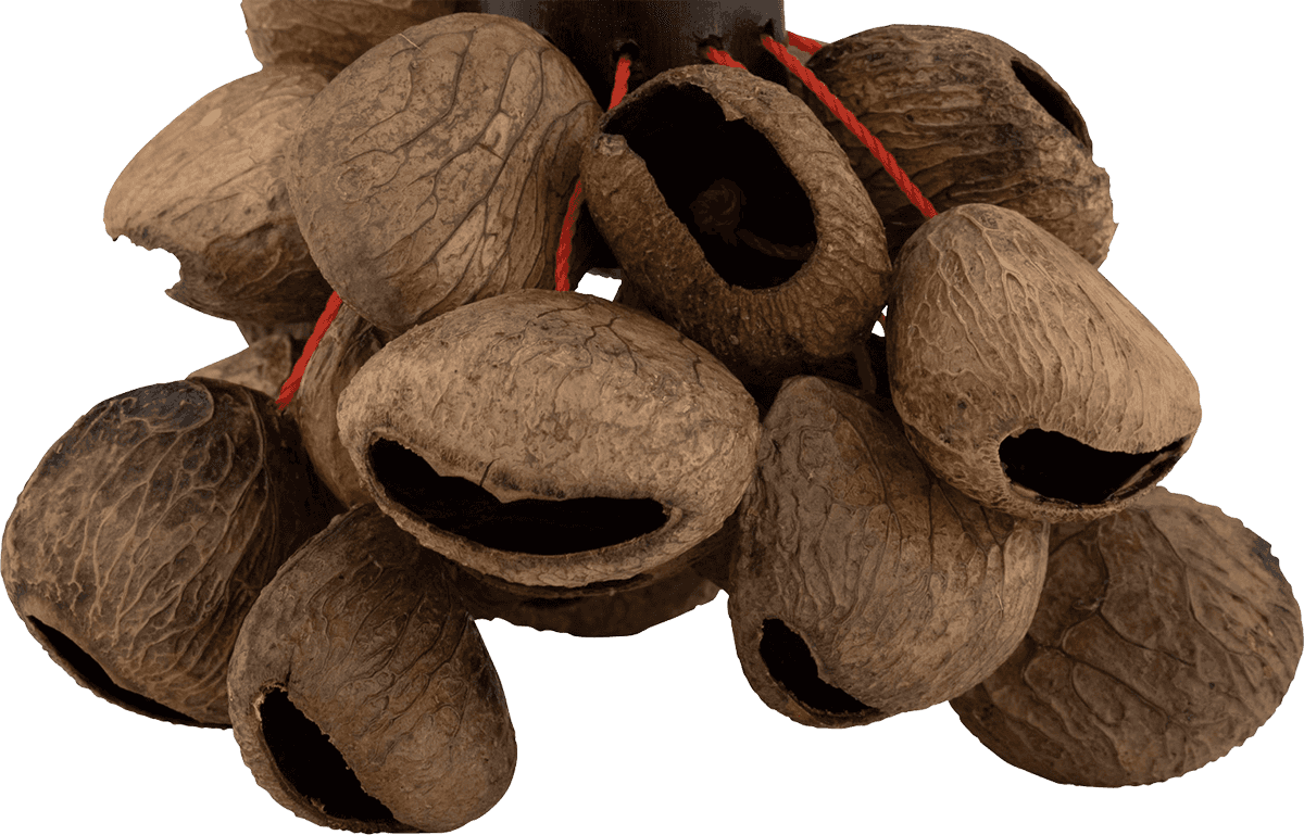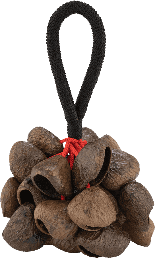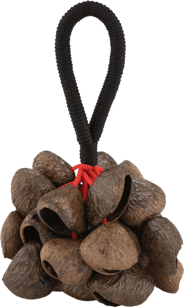 Le shaker Pangi Nut est fabriqué à partir des graines contenues dans le fruit du Pangium, un arbre originaire d'Asie du Sud-Est. Les noix de pangi sont de la taille d'une noix et sont creusées pour fabriquer le shaker. La poignée en corde de 7 pouces est reliée à environ 20 noix de pangi enfilées individuellement. Les noix les plus grosses créent un ton naturel plus profond.