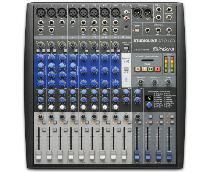 Ne vous laissez pas abuser par son design de table de mixage analogique classique : la StudioLive® AR12c a été conçue pour enregistrer. Avec un étage d'entrée analogique transparent, huit préamplis micro XMAX à gain élevé et une interface audio 14x4, 24 bit, 96 kHz, sa conception hybride permet d'enregistrer facilement des productions de studio et de mixer des spectacles live à partir d'une seule et même console, qui plus est intuitive. Ajoutez-y un égaliseur analogique musical à trois bandes, un amplificateur micro/ligne pour les synthés vintage et les microphones broadcast à faible niveau, de tout nouveaux effets numériques avec d'amples réverbérations et de riches délais, la connectivité Bluetooth et un enregistreur stéréo sur carte SD, et vous obtenez une centrale de mixage et d'enregistrement qui répond aux besoins à la fois des musiciens modernes et des créateurs de contenu.