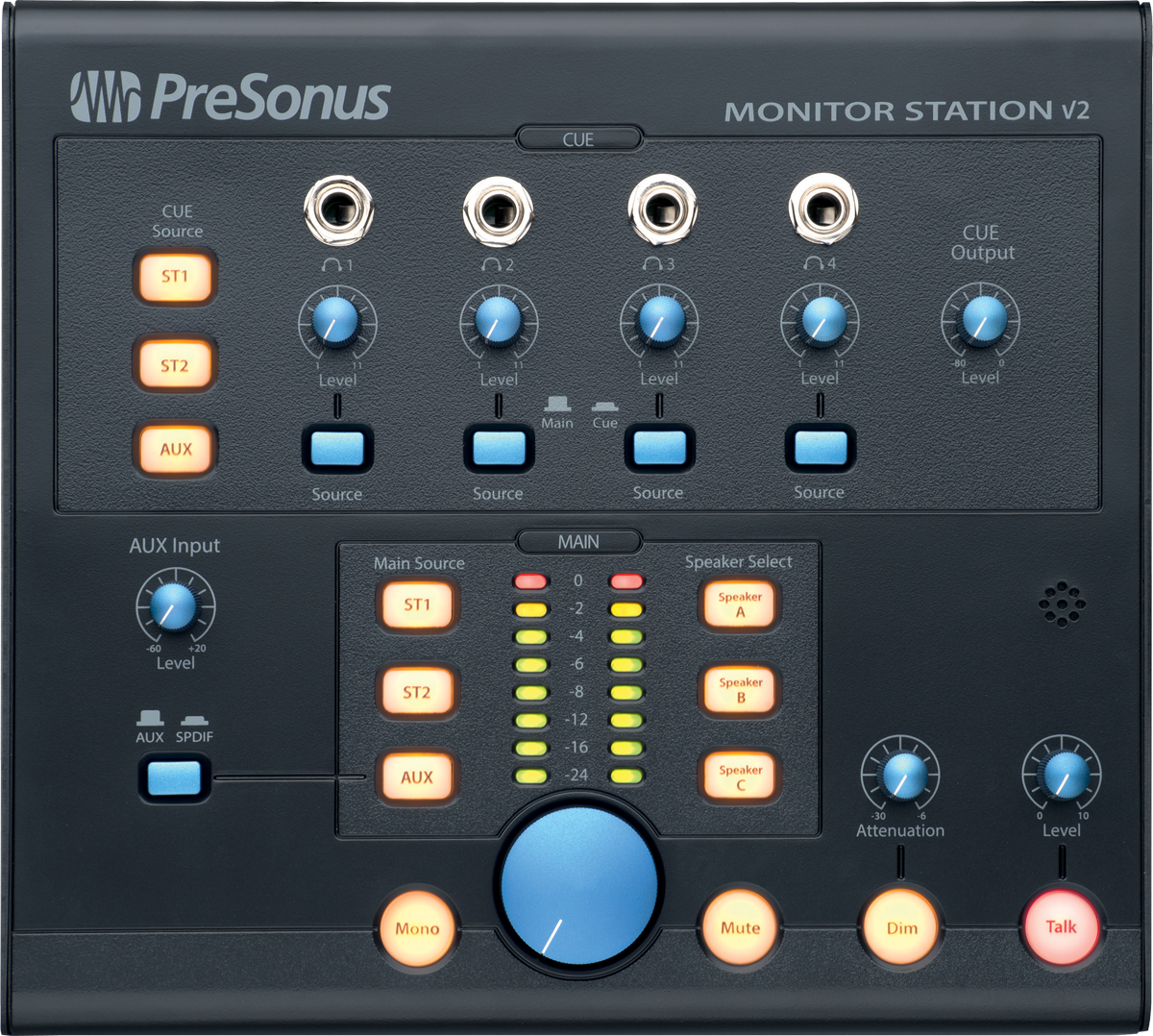 Les centrales de contrôle du monitoring permettent d'avoir toujours à portée de la main un contrôle du volume, un bouton d'ordre (talkback) avec micro intégré ou déporté sur entrée XLR, et la possibilité de brancher et de switcher entre 3 paires d'enceintes pour une maîtrise accrue du mixage.