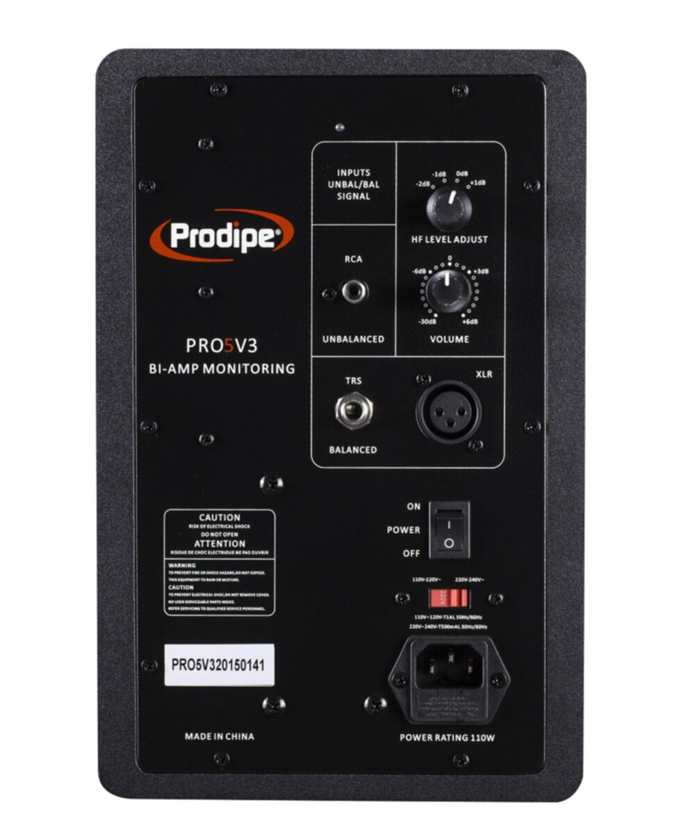 Moniteurs audio professionnels pour le studio, 50 + 25 Watts RMS, bi-amplifiés. Couplées avec le caisson de basse PRO 10S V3, les Prodipe Pro5 V3 vous offrent l'écoute Studio à moindre coût. La gamme des enceintes Pro5, Pro8 et Pro10S évolue et vous est présentée dans sa nouvelle version V3 : nouveau woofer avec membrane en fibre de verre, nouveau tweeter à dôme en néodymiun et nouvelle électronique pour encore plus de rapidité, de dynamisme et de présence. Les woofers sont désormais équipés de membrane en fibre de verre. En équipant toutes nos enceintes avec des membranes en fibre de verre, nous avons encore gagné en rapidité et en dynamisme, la réponse en fréquence est encore plus droite et le résultat à l'écoute est d'un naturel saisissant. Les aimants des transducteurs sont blindés par des caches en acier anodisés. Le filtrage actif a entièrement été revu afin d'avoir des fréquences de séparation sans accident, ni bosse, le renversement de la phase, ainsi que le coupe-bas du caisson sont ajustables. L'habillage du caisson est fait d'un bois à forte densité afin de garantir une qualité sonore constante et sans vibration indésirable. Contrairement à de nombreuses autres références, nous avons placé l'évent de type « Bass reflex » sur l'avant afin d'améliorer la décompression sur les basses, ce qui permet un positionnement de l'enceinte bien plus facile. La connectique est complète pour une utilisation universelle :XLR / Jack TRS 6.35 pour une connexion symétrique, et Cinch (RCA) pour une connexion asymétrique. Une ligne compacte et élégante, des finitions soignées. Marque : Prodipe Amplification : 75W RMS : Puissance HF RMS (crête) : 25W (40W) Puissance LF RMS (crête) : 50W (90W) Dimensions : 277(H)×180(W)×245(D) mm Poids : 5.5 Kgs Réponse en fréquence : 55Hz--22kHz Fréquence : 3KHz Rapport signal - bruit : 82dB/90dB Tweeter : dôme 1" en néodymium Woofer : membrane en fibre de verre 5.25'' Connecteurs d'entrée : XLR (3-pins) (Symétrique) 1/4" TRS - 10k Ohm (Symétrique) RCA - 10k Ohm (Asymétrique) Ajustement des aïgues : +1dB / 0dB / -1dB / -2dB