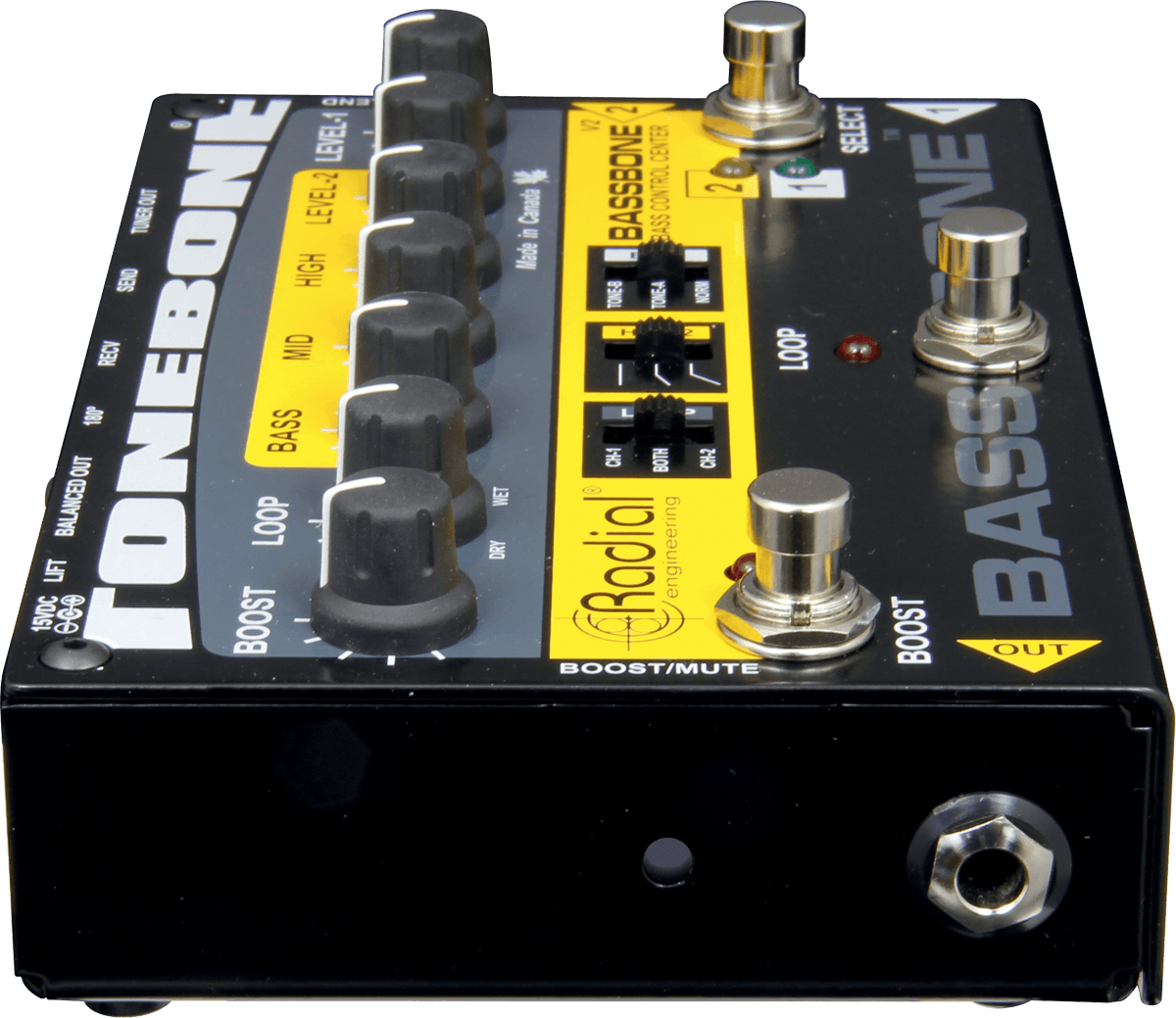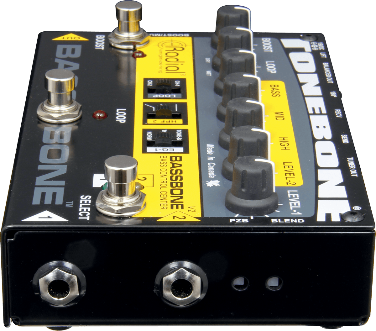 Aujourd'hui, la plupart des bassistes utilisent au moins deux basses sur scène. Peut-être l'une d'elle est une basse vintage à faible niveau de sortie et l'autre, une fretless à six cordes active.Alterner entre ces basses pendant un show exigerait des changements d'EQ et de volume sur l'ampli, chaque instrument étant très différent l'un de l'autre. Jusqu'à présent, la seule option était de compromettre les réglages de l'ampli. Mais plus maintenant : entrez dans le monde de la Bassbone.La Bassbone résout le problème en fournissant 2 canaux de réglages distincts.Le canal 1 va directement à l'ampli avec en plus un gain et un voicing qui fonctionnent directement avec l'EQ de l'ampli.Pour la deuxième basse, le canal 2 utilise un réglage de gain séparé et un EQ actif puissant à 3 bandes qui permet de modifier drastiquement les réglages EQ de l'ampli. Lorsque une seule basse est reliée, la Bassbone fonctionne comme un préampli à deux voies, permettant à la basse d'avoir deux réglages différents de gain et d'EQ.Pour plus de punch, la Bassbone a un booster entièrement réglable et une boucle d'effets pour des solos ou effets sonores.Une boîte directe intégrée fournit une sortie XLR symétrique qui est postEQ, volume et boucle d'effets. Ceci vous permet de garder le contrôle de votre son sans devoir solliciter le sonorisateur. En fait, avec la sortie symétrique et l'EQ puissant de la Bassbone, vous n'avez même pas besoin de votre ampli en concert ! La sortie symétrique marche aussi très bien pour l'enregistrement direct.