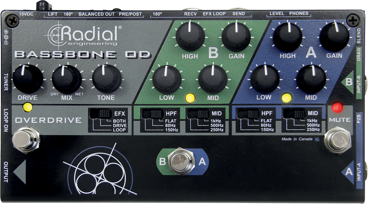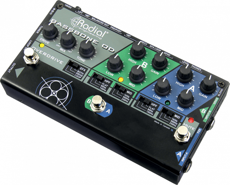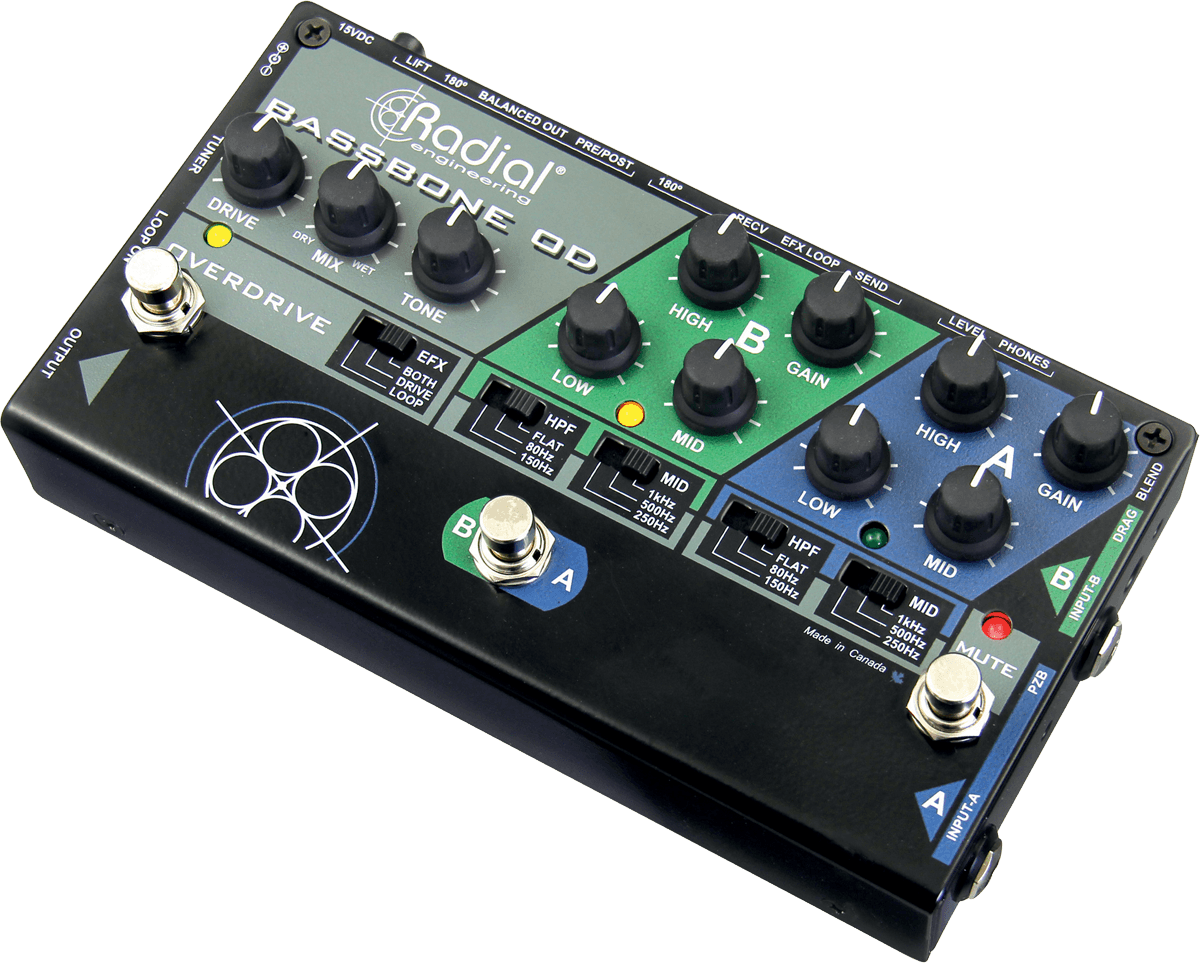PREAMPLIS / SELECTEURS Radial - SRA BASSBONE-OD Préamp 2 basses 2 canaux + OD.