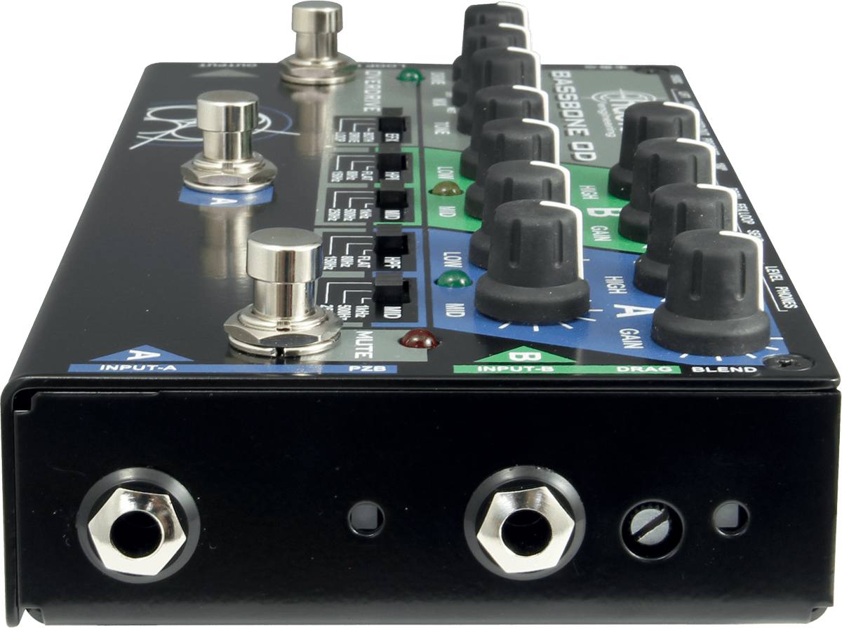 Le Bassbone OD est un préampli basse avec 2 entrées instrument, dont chacune dispose de son contrôle de niveau, d'un égaliseur passif interactif super puissant et d'un filtre basse fréquence pour aider à éliminer les résonances.Le canal A est équipé d'un footswitch PZB qui augmente la sensibilité et la charge à 10 Mohms afin d'optimiser la réponse pour les capteurs piézo-électriques régulièrement employés à la contrebasse.Le canal B, quant à lui, agit sur la correction de charge (impédance) qui vise à optimiser la réponse d'un instrument passif comme une basse électrique vintage.La bascule entre les canaux se fait en utilisant le footswitch et les 2 canaux peuvent être mélangés en appuyant sur l'interrupteur de 'blend', si un système de micro double est employé.Le Bassbone OD est également pourvu d'une sortie instrument en jack (6,35 mm) pour attaquer un ampli sur scène et une sortie symétrique DI à faible impédance pour un système de sonorisation.La sortie XLR peut être assignée 'pre ou post' effets en fonction des préférences de l'ingénieur.Une sortie tuner 'bufferisée' dédiée travaille avec le commutateur au pied MUTE pour un accordage silencieux sur scène.Pour les bassistes qui utilisent des effets, les 2 canaux d'entrée peuvent partager les mêmes pédales en se connectant via la boucle d'effets. Le tout agrémenté d'une section overdrive embarquée avec contrôles de DRIVE, LEVEL et TONE. Un mélange 'wet/dry' vous permet d'ajouter un léger grain semblable à un Ampeg SVT ou bien une grosse distorsion si désiré.La pédale d'OD peut être affectée à la boucle, overdrive ou les deux.Enfin, un ampli casque intégré avec sortie jack (3,5 mm) vous permet d'utiliser la Bassbone dans le bus pour les longs trajets entre les concerts.Le Bassbone OD, le préampli basse le plus puissant du monde dans une seule pédale.