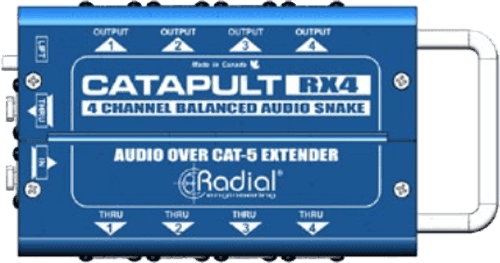Les Catapult sont des séparateurs audio modulaires 4 canaux, présentant un module émetteur et récepteur transmettant un signal analogique ou numérique (AES) via un câble blindé CAT5. Chaque module émetteur dispose de 4 entrées et 4 sorties XLR, connecté à un module récepteur offrant deux séries de 4 sorties XLR. Ce système offre une flexibilité exceptionnelle grâce aux 6 modules équipés sorties XLR parallèles, et des sorties isolé niveau micro ou ligne. Chaque module est équipé d'un interrupteur de masse éliminant les interférences.