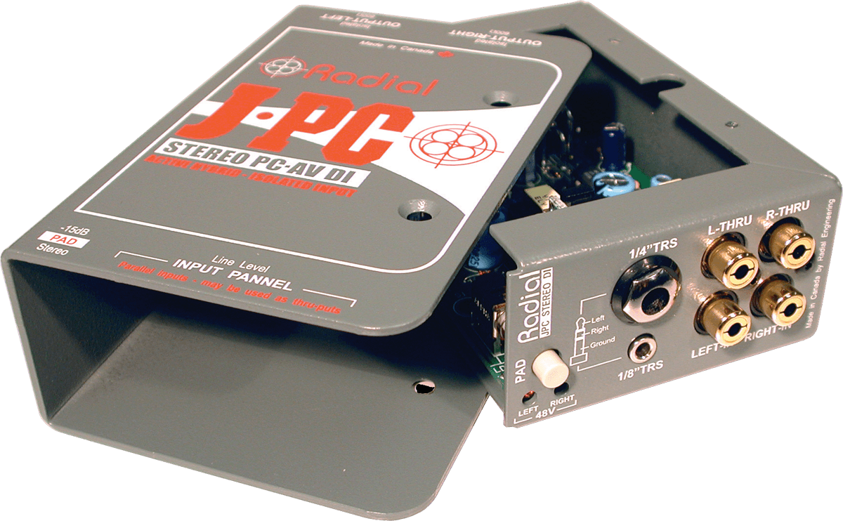 La Radial JPC est une DI stéréo spécialement conçue pour interfacer des cartes sons ou des appareils électroniques grand public aux systèmes de sonorisation professionnels.