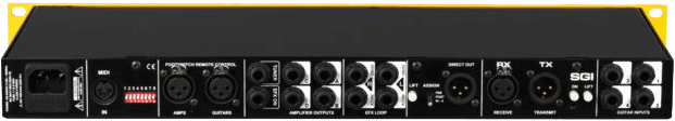 - Boucle SGI : connecteurs XLR RX (récepteur) et TX (émetteur) pour connexion avec le SGI-44 pour relier les amplis aux guitares ou aux pedalboards sur de longues distances.