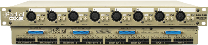 Splitter micro 8 canaux-Jensen: Les 8 XLR de façade sont connectés en parallèle avec un sub-D 25 et un connecteur à vis type Euro-block pour les installations fixes. Il y a 3 sorties différentes pour chaque canal : une sortie direct (avec transmission de l'alimentation phantom) pour la table de mixage, une autre sortie directe avec un switch de coupure de masse pour les monitors et une sortie isolée via transfo pour l'enregistreur. Le OX8 est passif et ne nécessite donc aucune alimentation. Il est idéal en live ou pour des installations fixes où des signaux micros ou ligne doivent être envoyés sur plusieurs systèmes simultanément.