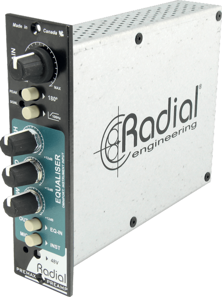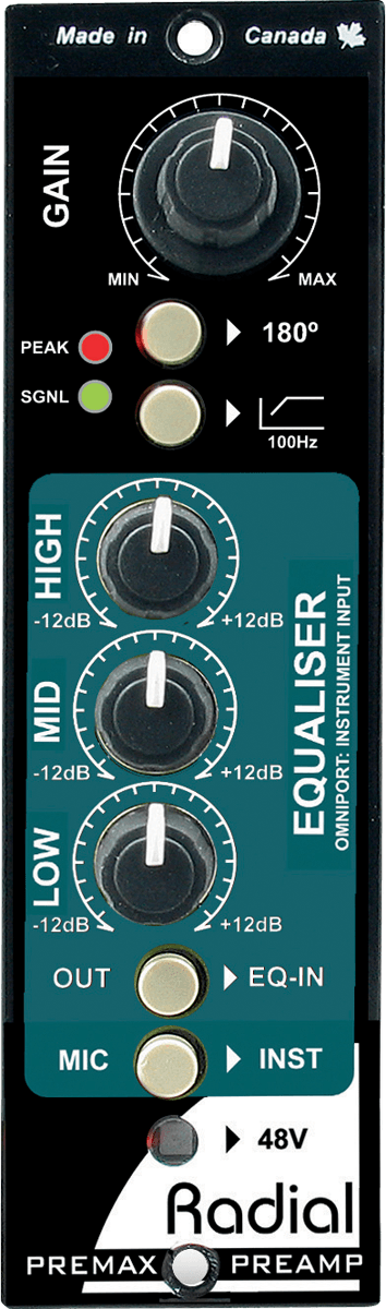 Les niveaux sont représentés par deux LED, Signal/Peak. Le préampli passe ensuite par un EQ 3 bandes musical qui permet de booster en douceur les aigus pour plus de clarté, ajouter de la chaleur dans le bas du spectre, ou de réduire les médiums d'un instrument trop agressif. Un commutateur en façade vous permet de contourner l'EQ et de comparer l'effet pré/post. Un filtre passe-haut élimine les résonances graves gênantes et l'inversion de polarité, à 180 ° agit, soit à aider à aligner une configuration micro stéréo ou rendre compatible le PreMax avec du matériel vintage. Par mesure de sécurité, l'interrupteur d'alimentation fantôme 48V est encastré pour éviter les commutations accidentelles. Lorsqu'il est utilisé avec un rack Workhorse Radial, le connecteur TRS Omniport est configuré comme entrée instrument et activé, à l'aide d'un interrupteur sur le panneau avant. Lorsque l'Omniport n'est pas connecté, le commutateur agit comme un mute.