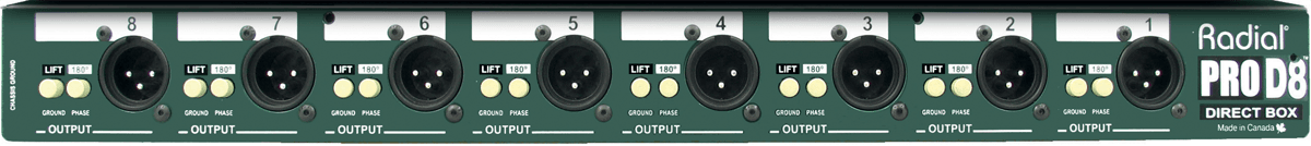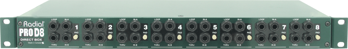 La Pro D8 est équipée de 8 transformateurs Radial, chacuns d'eux étant isolés magnétiquement afin de réduire les bruits parasites causés par les champs magnétiques extérieurs. Afin de pouvoir traiter efficacement les signaux de forte amplitude, un switch pad de -15dB est présent en façade.