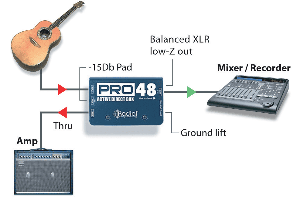 La Radial Pro48 est une DI active (alimentée par l'alimentation phantom) haute performance spécialement conçue pour les instruments de musique à haut niveau de sortie comme les guitares acoustiques préamplifiées et les basses actives.