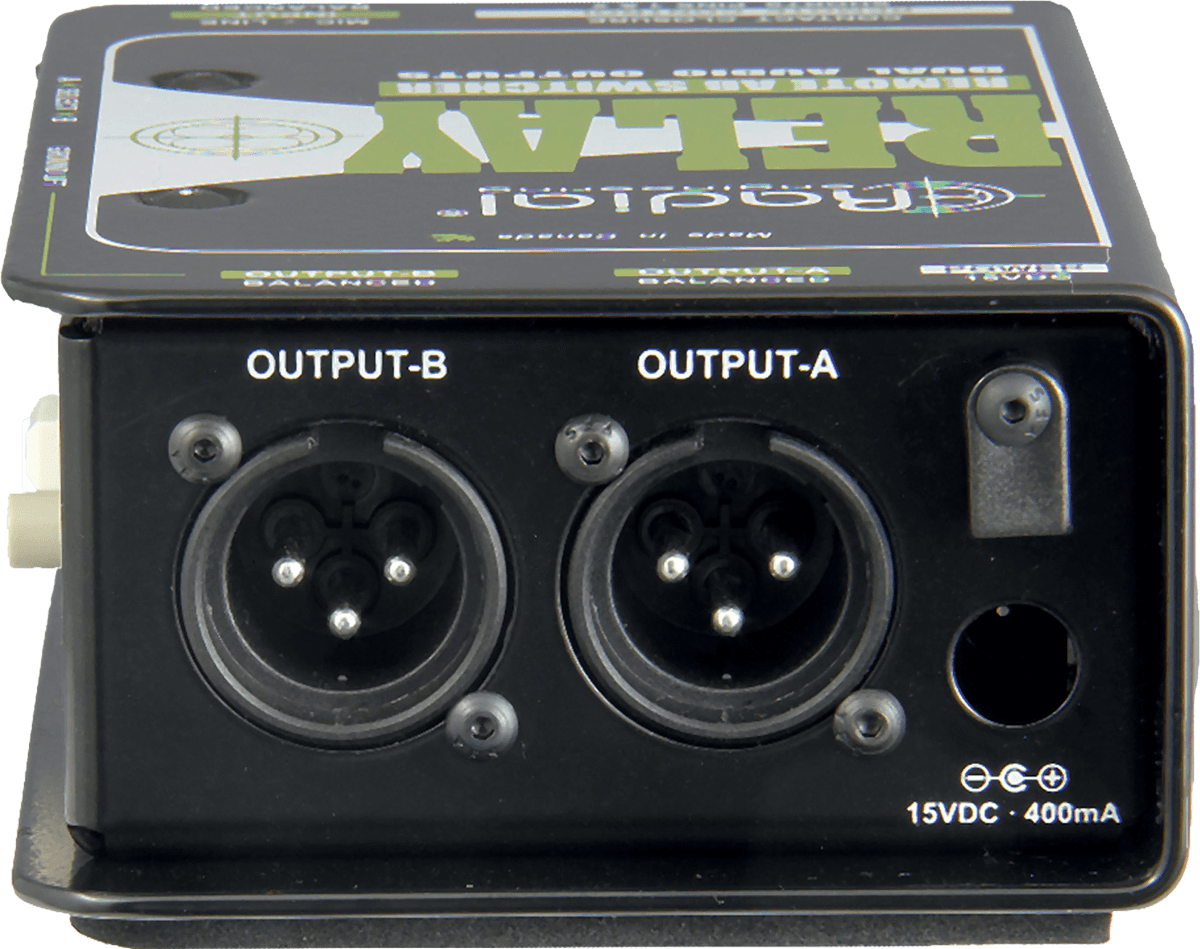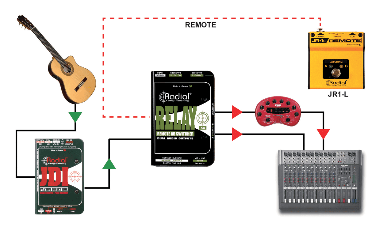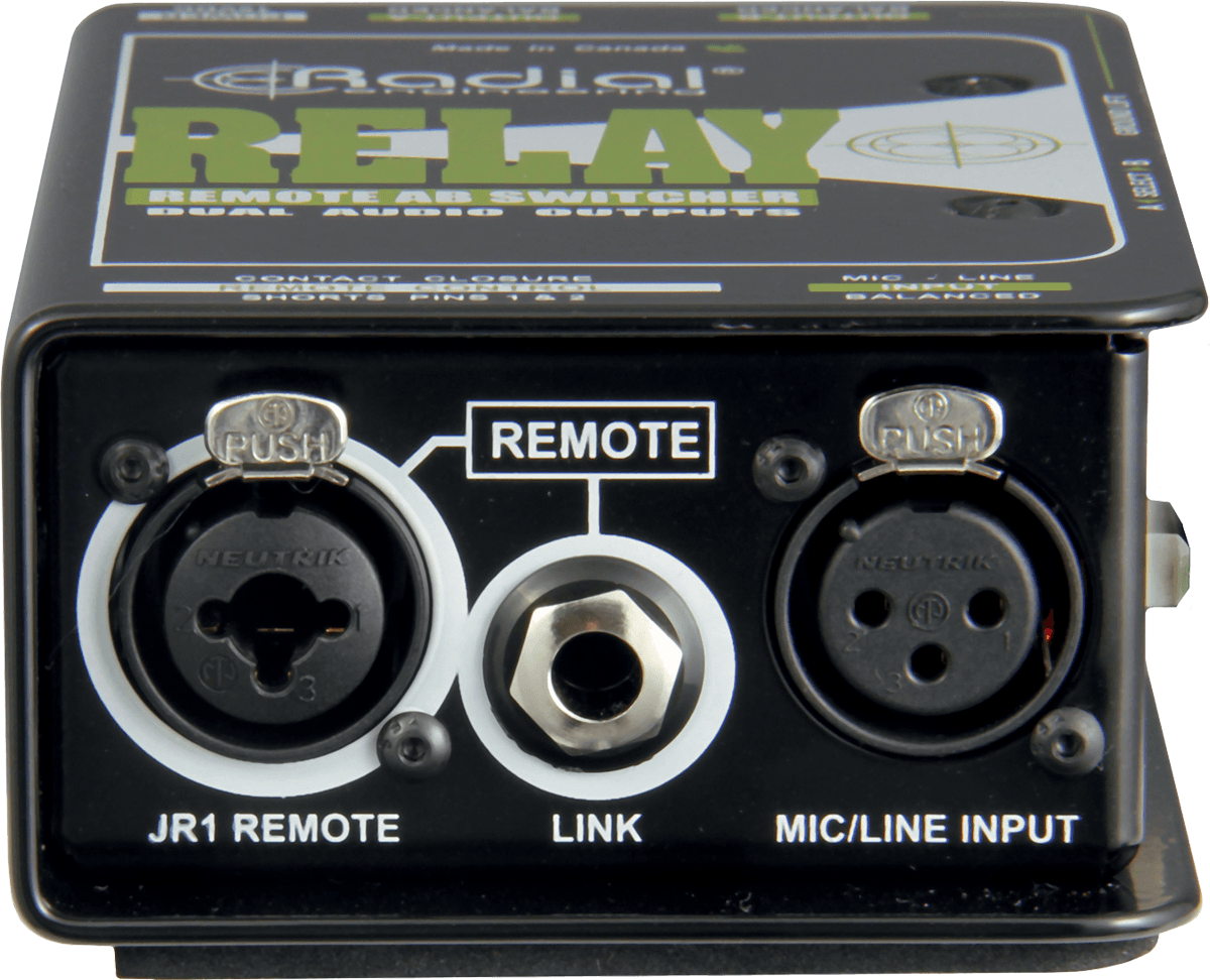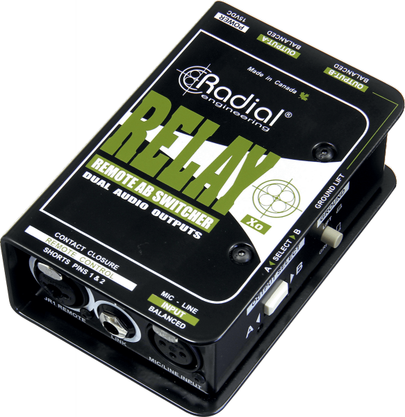 La commutation peut être effectuée en utilisant l'interrupteur situé sur le côté du boitier ou par commande à distance via les connecteurs XLR combo et jack 6,35mm en utilisant soit la pédale RadialJR1-L (à verrouillage) ou JR1-M (momentanée).