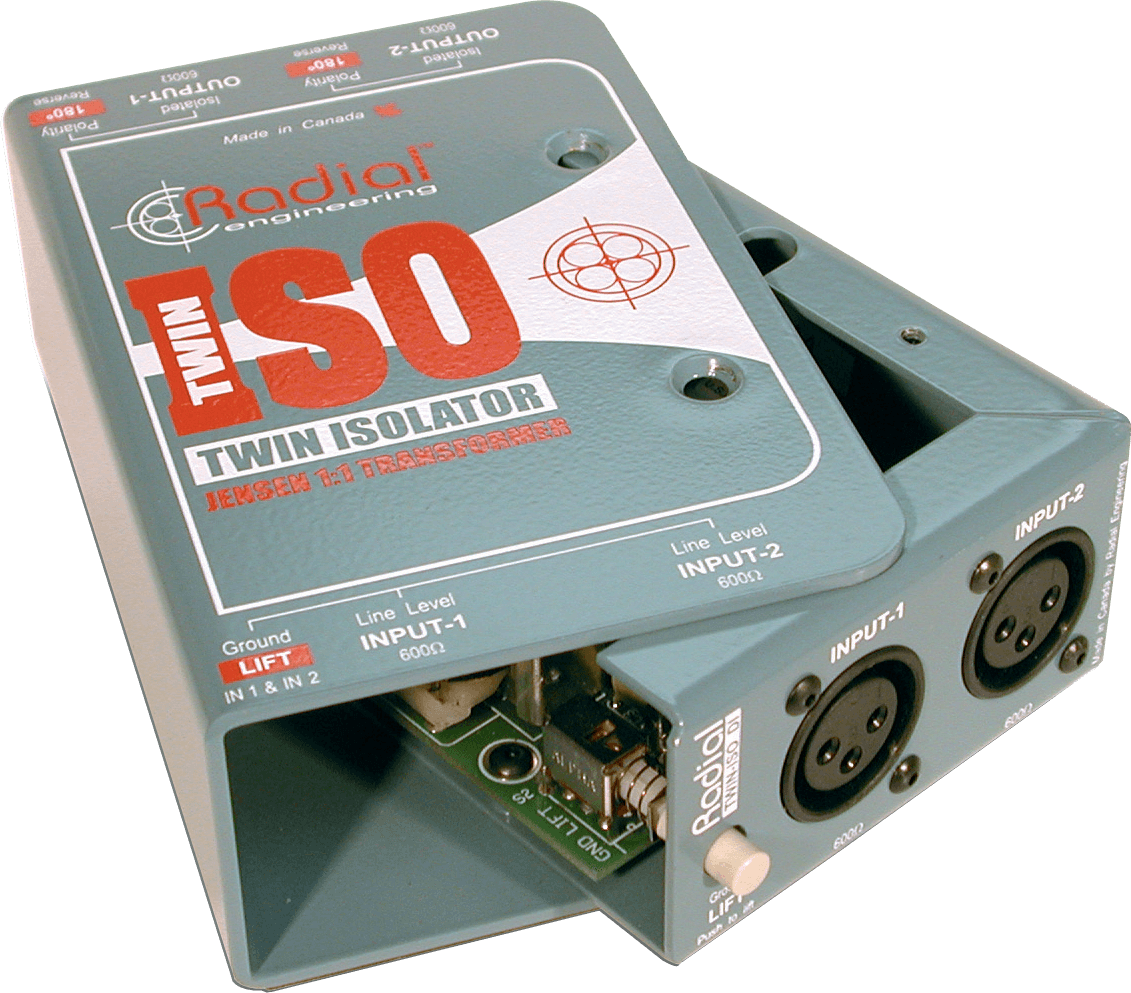 Le Radial Twin-Iso est un isolateur passif de ligne +4dB stéréo spécialement développé pour les systèmes de diffusion sonore professionnels afin d'éliminer les hums et autres buzzs engendrés par les boucles de masses causés par l'interfaçage de 2 équipements entre eux (2 consoles de mixage par exemple).