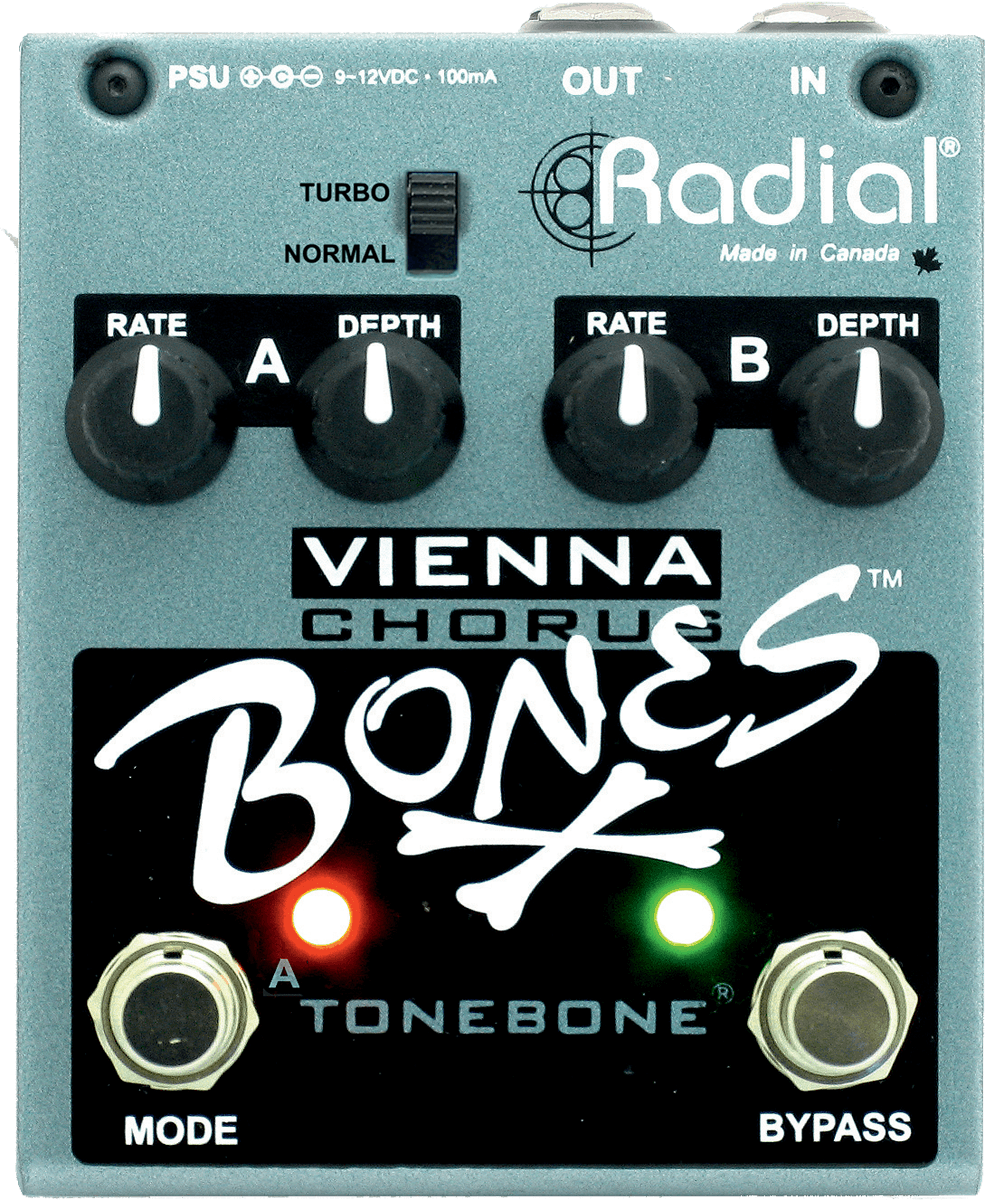 La Bones Vienna Chorus est une pédale Chorus à deux canaux qui simule l'effet d'un haut-parleur Leslie tournant.Elle permet au guitariste d'instantanément passer d'un effet subtil au chorus le plus coloré qui soit, d'une seule pression du pied.Contrairement aux pédales chorus numériques, la Vienna Chorus est de type "old school". L'empreinte sonore si distincte et chaude est captée grâce à la puce Panasonic MN3007, composant ayant eu son heure de gloire dans les années 80.Son très faible bruit de fond la rend particulièrement impressionnante et lui permet de rivaliser avec des solutions numériques actuelles haut de gamme. Enfin une pédale au caractère vintage !Chaque canal est équipé de son contrôle de vitesse et d'un réglage de profondeur.Le "mode turbo" ajoute une forme d'onde de fréquence d'oscillateur tout en augmentant le champ d'action. Ceci permet de passer d'un Chorus léger à un tremolo extrême ou vibrato ronflant, ouvrant la porte à l'exploration de nouveaux paysages sonores.