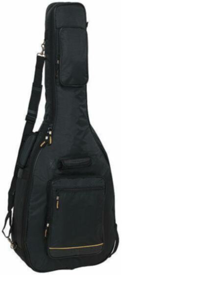 HOUSSE WESTERN • Matériau Rok Tex résistant à l’eau, épaisseur 25 mm • Revêtement intérieur nylon renforcé avec attache de sécurité pour l'instrument • Deux bretelles réglables avec épaulières • Bbretelle supplémentaire pour portage à l’épaule • Forme arrière ergonomique • Fermeture éclair 8 mm à double sens • Deux poignées renforcées à l’avant et sur le dessus de la housse • Deux pochettes extérieures superposées dont une au format A4 • Pochette supplémentaire au niveau du manche • Pochette transparente pour carte d’identification • Protections intérieures au niveau des mécaniques, du cordier et de l'attache courroie • Renforcement PVC à la base de la housse avec pieds métal • Crochet métal permettant de suspendre la housse • Logo gaufré