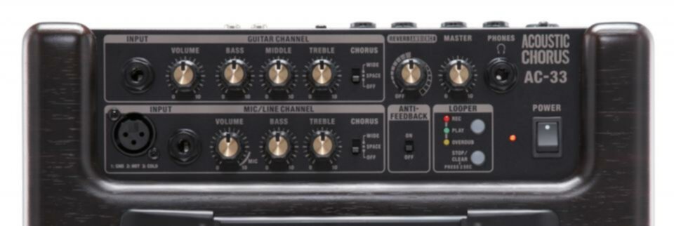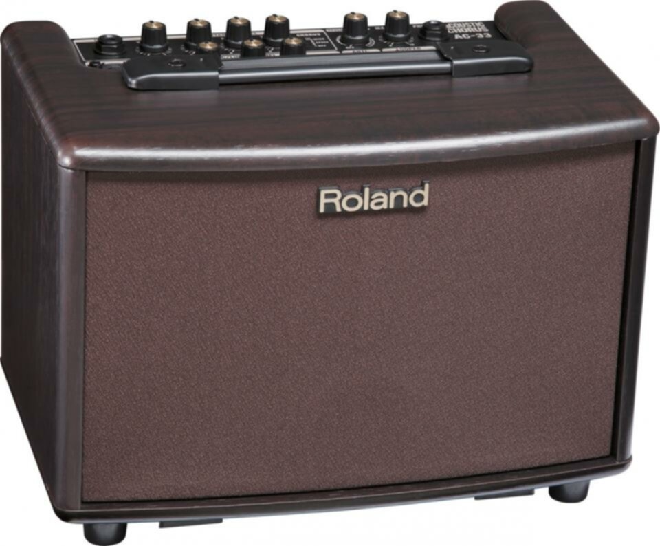 L’élégance du bois est un plaisir inépuisable pour les yeux, chez soi comme au studio, et met en avant la splendeur des guitares acoustiques. L’AC-33 est le premier ampli au monde conçu spécialement pour guitare acoustique et alimenté par piles. Portatif mais puissant, l’AC-33 délivre un son réellement stéréo et est pourvu d’entrées de guitare et micro/ligne, d’effets taillés sur mesure, d’un anti-larsen et d’une fonction «Phrase Looper». Grâce à son alimentation par piles, l’AC-33 vous permet de vous produire où bon vous semble: dans les coins les plus reculés, dans les rues, là où votre imagination vous mène… Ampli stéréo 15W + 15W Alimentation: 8 piles AA ou adaptateur. Entrées guitare et micro/ligne XLR. Chorus, réverbération, ambience, égalisation à 3 bandes, anti-larsen. Fonction «Looper». Son naturel stéréo Doté de la dernière technologie DSP Roland, l’AC-33 délivre des sonorités acoustiques aussi pures que riches avec une puissance inimaginable pour un si petit volume. Sa conception véritablement stéréo (15W x 2) permet de profiter d’un chorus stéréo/multibande brillant avec mode «Wide» ainsi que d’une réverbération étincelante et d’un effet "Ambience" de type 3D conçus spécifiquement pour guitare acoustique. Jouez et chantez L’AC-33 dispose de deux canaux distincts: Guitar et Mic/Line. Branchez-y une guitare acoustique et un micro (ou un instrument de niveau ligne) et traitez les signaux séparément. Chaque canal dispose de son propre réglage de volume, d’égalisation multibande et de chorus. Le canal Mic/Line dispose d’entrées XLR et 1/4”. Vous pouvez également brancher un lecteur MP3/CD à l’entrée AUX stéréo pour accompagner vos exercices ou vos interprétations. Vous trouverez de plus des commandes globales de volume, de réverbération, d’effet "Ambience" et d’anti-larsen. Phrase Looper La fonction «Phrase Looper» de l’AC-33 vous permet d’enregistrer, de mettre en boucle et d’improviser sur vos riffs de guitare ou des phrases audio venant de l’entrée AUX. Enregistrez une phrase allant jusqu’à 40 secondes puis reproduisez-la en boucle et ajoutez-y de nouveaux enregistrements selon l’inspiration du moment. Puissance de sortie nominale: 15W+15W (avec l’adaptateur secteur), 10W+10W (avec des piles alcalines) Niveau d’entrée nominal (1kHz): Canal GUITAR: �"10dBu, Canal MIC/LINE: �"50dBu/�"20dBu, AUX IN: �"10dBu Niveau de sortie nominal (1kHz): LINE OUT: �"10dBu Haut-parleurs: 12cm (5”) x 2 Commandes: Canal GUITAR: Commande VOLUME, Commandes de l’égaliseur (BASS, MIDDLE, TREBLE), Commutateur CHORUS Canal MIC/LINE: Commande VOLUME, Commandes de l’égaliseur (BASS, TREBLE), Commutateur CHORUS Commande REVERB/AMBIENCE ANTI-FEEDBACK: Commutateur ON/OFF LOOPER: Bouton REC/PLAY/OVERDUB, Bouton STOP/CLEAR Commande AUX IN Commande LEVEL Commande MASTER Commutateur POWER Témoins: REC/PLAY/OVERDUB, POWER Prises: Prises AUX IN (RCA/cinch, mini-jack stéréo), Prises LINE OUT (L/MONO, R) (jacks 1/4”), Prise PHONES (jack 1/4” stéréo), Prises FOOT SWITCH (jacks 1/4” TRS), Prise DC IN Alimentation: Adaptateur secteur (fourni, DC 13V), Piles sèches LR6 (AA) (alcalines) x 8 ou piles rechargeables HR6 (AA) (Ni-MH) x 8 Consommation: 490mA Durée de vie estimée de la batterie en utilisation continue: Piles alcalines: environ 8 heures; Ni-MH: environ 9 heures. Ces valeurs varient selon les conditions d’utilisation. Accessoires: Mode d’emploi, Adaptateur secteur, Cordon d’alimentation Options: Commutateur au pied: BOSS FS-5U, FS-6, Câble de connexion: PCS-31L Roland Dimensions : 318mm (L) x 223mm (P) x 243mm (H) Poids (piles comprises): 4,7kg 0dBu= 0.775 Vrms En vue d’améliorer le produit, ses caractéristiques techniques et/ou son aspect peuvent être modifiés sans avis préalable.
