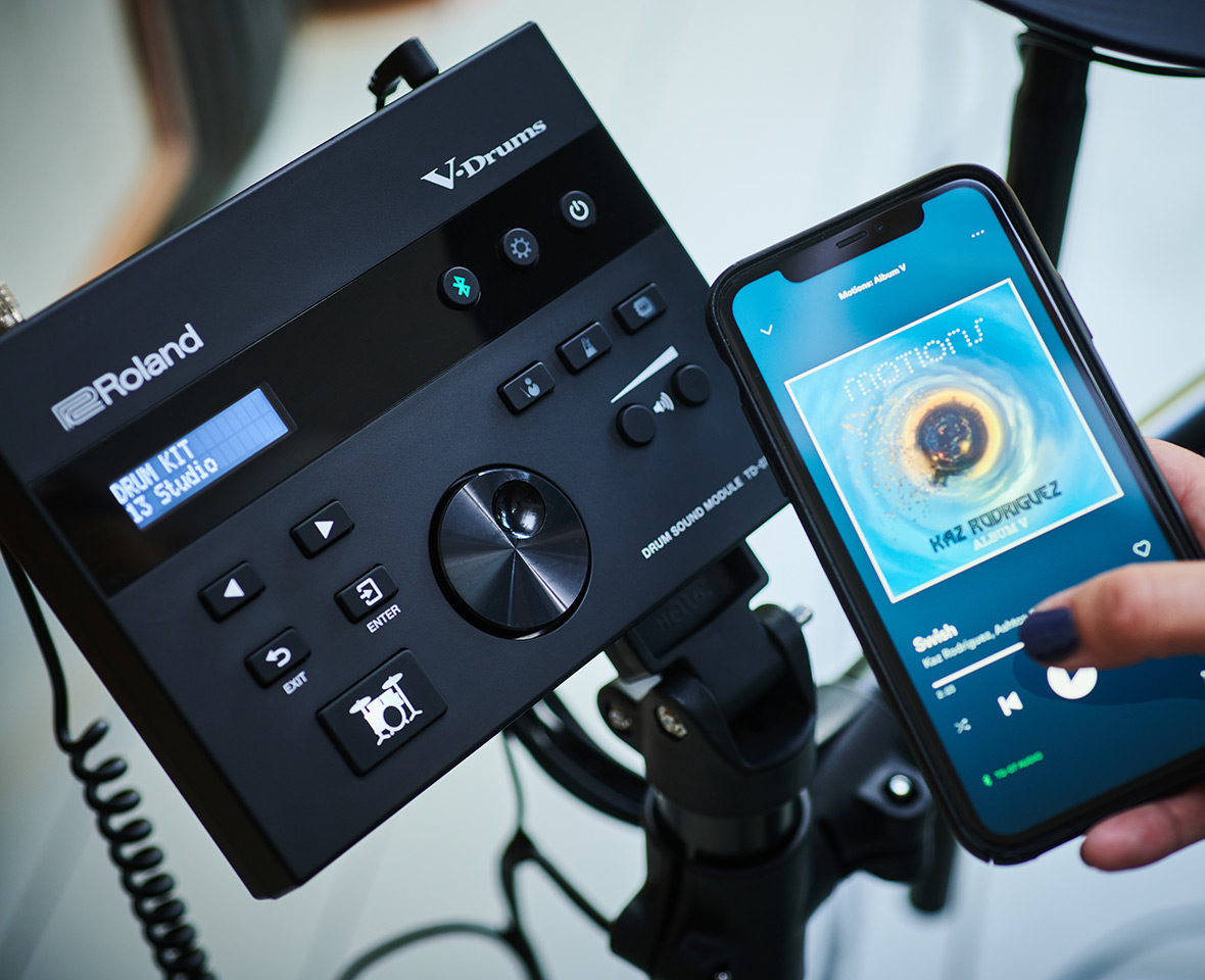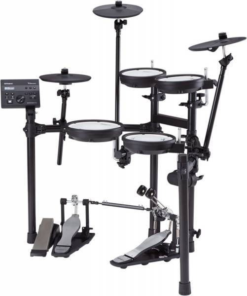 Le plus compact et économique des kits TD-07 Compact et doté d'un prix attractif, mais proposant des sons, sensations et fonctions professionnels pour booster votre jeu de batterie, la TD-07DMK constitue le kit d'entrée de gamme V-Drums TD-07. Bien que ses pads de caisse PDX-8 et de toms PDX-6A soient plus petits que sur les kits de gamme supérieure, ils procurent des sensations tout à fait satisfaisantes grâce à leur peau Mesh Roland à double épaisseur et ultra silencieuse. Les cymbales Ride et Crash compactes CY-5 vous permettent de jouer avec expressivité même lorsque l'espace est réduit, tandis que le pad de grosse caisse, monté sur le rack, ajoute à la compacité de cette TD-07 et la rend parfaite en tant que batterie domestique. Malgré sa taille compacte, vous pouvez tout de même voir grand grâce à des caractéristiques qui permettent d'aller bien plus loin que sur un kit acoustique. Des sons de batteries authentiques vous permettent de jouer dans de nombreux styles et genres, et les possibilités d'édition détaillée des divers paramètres vous autorisent à créer votre kit idéal. Le mode Coach intégré vous aide à apprendre, et la connectivité Bluetooth à jouer sur de la musique diffusée par votre smartphone, tablette ou ordinateur. Le port USB permet quant à lui d'enregistrer directement des parties de batterie sur ordinateur. Des sensations V-Drums authentiques. Depuis 1997, les V-Drums Roland sont devenues le standard en matière de batteries électroniques. Souvent imitées mais jamais égalées, les V-Drums procurent les sons, les sensations et l'expérience de jeu d'un kit acoustique, fournies par une technologie, des fonctions et une fiabilité que vous ne trouverez nulle part ailleurs. Et en tant que kit d'entrée de gamme TD-07, la TD-07DMK met l'héritage V-Drums à portée des tous les batteurs, qu'ils soient débutants ou expérimentés. SPECIFICATIONSKit configuration (*1)Kick: KD-2 Snare: PDX-8 Hi-hat: CY-5 Hi-hat control pedal: Half-open stroke detectable Tom: PDX-6A x 3 *2 Crash: CY-5 Ride: CY-5 Drum stand: Four-post type rack standDrum kits50 (Preset: over 20)Instruments143Effect TypesPad Equalizer: each pad Overhead Mic Simulator Room Multi-Effects: 1 system, 30 typesCoach functions (5 modes)Time check (easy) Time check (hard) Quiet count Auto up/down Change-upMetronomeTempo (20--260) Rhythm type (5 types) Sounds (15 types)BluetoothSupported standards: Bluetooth Ver 4.2 Supported profile: A2DP (Audio), GATT (MIDI over Bluetooth Low Energy) Codec: SBC (Support to the content protection of the SCMS-T method)Display16 characters x 2 lines LCD (with backlight)ConnectorsOUTPUT/PHONES jack: Stereo miniature phone type MIX IN jack: Stereo miniature phone type USB COMPUTER port: USB B type TRIGGER INPUT connector: DB-25 type (Kick, Snare, Tom 1, Tom 2, Tom 3, Hi-hat, Crash 1, Crash 2, Ride, Hi-hat control)USB COMPUTERSpeed: Hi-speed USB Driver mode: Generic, Vender Protocol: USB MIDI, USB Audio *3USB AudioSampling Rate (original): 44.1 kHz Sampling Rate (with sampling rate converter): 96 kHz, 48 kHz Record: 2 channels Playback: 2 channelsPower supplyAC adaptor (DC 12 V)Current draw250 mAAccessoriesSetup Guide Owner's Manual Leaflet "USING THE UNIT SAFELY" AC adaptor Special connection cableOptions (sold separately)Additional crash cymbal (Crash2): CY-5, MDY-Standard *4 Personal drum monitor: PM series V-Drums accessory package: DAP-3X V-Drums mat: TDM series Noise eater: NE seriesSIZE & WEIGHTDimensions1,200 (W) x 1,100 (D) x 1,200 (H) mm 47-1/4 (W) x 43-5/16 (D) x 47-1/4 (H) inches Weight18.0 kg / 39 lbs 11 oz