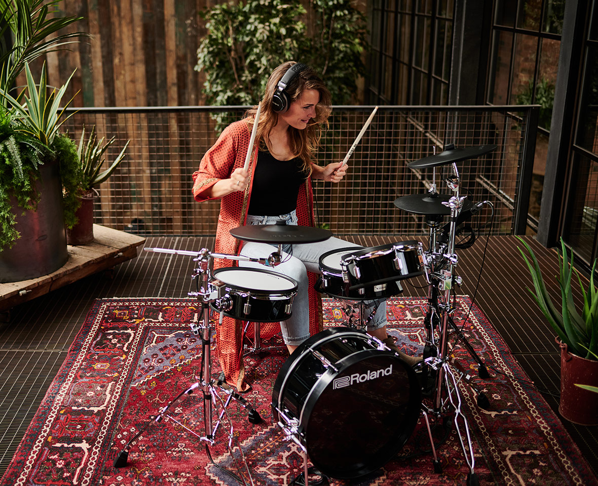 La disposition des toms, ainsi que les nombreuses cymbales, vous font vous sentir aussi à l'aise que sur une batterie acoustique. Vous pouvez monter les larges pads et cymbales de la VAD103 sur de véritables pieds pour entourer la grosse caisse 18 pouces et obtenir un look de batterie acoustique, mais aussi l'installer n'importe où chez vous grâce à sa compacité. Mais son module TD-07 vous permet d'aller bien plus loin qu'une batterie acoustique en vous proposant des kits authentiques pour tous les styles musicaux, des possibilités de les modifier totalement pour trouver votre son signature, un mode Coach qui vous permet d'améliorer votre technique, et la connectivité Bluetooth pour jouer avec vos groupes favoris en les écoutant sur votre smartphone, tablette ou ordinateur.