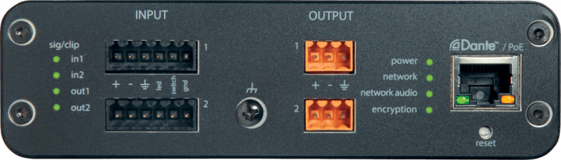 Cette interface Dante hybride possède à la fois 2 entrées analogiques avec broches logiques TTL et deux sorties analogiques, commutables micro/ligne avec borniers euroblock, dans un boîtier compact 1/3 rack. Chaque entrée et sortie possède un égaliseur paramétrique 4 bandes. Les deux entrées peuvent être mélangées et routées sur un seul canal Dante et les deux canaux Dante peuvent être mélangées et routées sur une seule sortie analogique. Elle est alimentée en PoE via la connexion Ethernet et est dotée d’une application web permettant le contrôle de tous les paramètres de l’interface via un simple navigateur. Elle est compatible avec les automates externes.