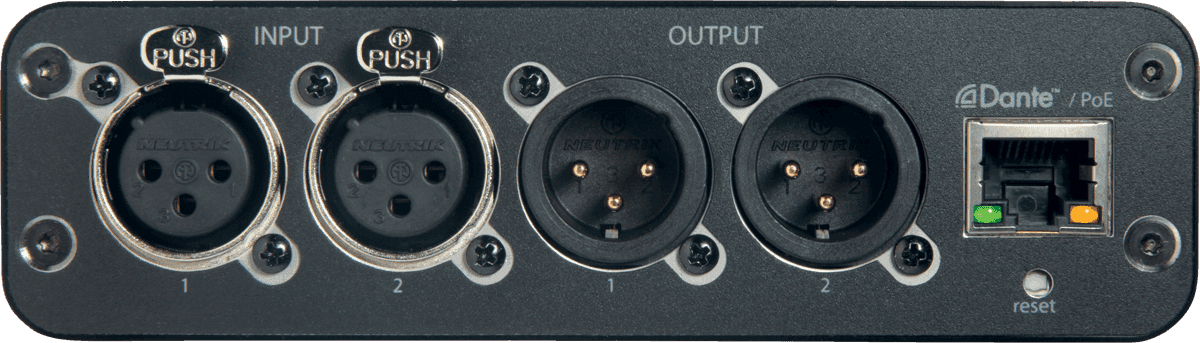 Cette interface Dante hybride possède à la fois 2 entrées analogiques et deux sorties analogiques en XLR, commutables micro/ligne, dans un boîtier compact 1/3 rack. Chaque entrée et sortie possède un égaliseur paramétrique 4 bandes. Les deux entrées peuvent être mélangées et routées sur un seul canal Dante et les deux canaux Dante peuvent être mélangées et routées sur une seule sortie analogique. Elle est alimentée en PoE via la connexion Ethernet et est dotée d’une application web permettant le contrôle de tous les paramètres de l’interface via un simple navigateur. Elle est compatible avec les automates externes.