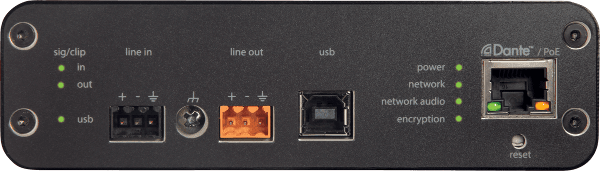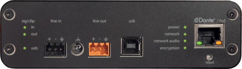 Cette interface permet la connexion de quatre canaux audio Dante et d’une source analogique à un système de visioconférence. Grâce à son port USB, elle permet de constituer un système de visioconférence très simple sur ordinateur utilisant un soft codec. La matrice de mixage intégrée offre un routage flexible des sources tandis que l’égaliseur paramétrique et le limiteur assurent un contrôle précis de la qualité audio de la réunion.