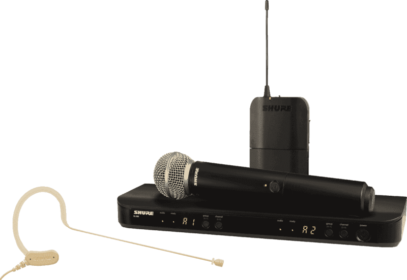 Composé d'un récepteur double BLX88E, d'un émetteur main capsule SM58, d'un émetteur ceinture BLX1 et et d'un micro tour d’oreille statique omnidirectionnel couleur chair MX153T-O-TQG.