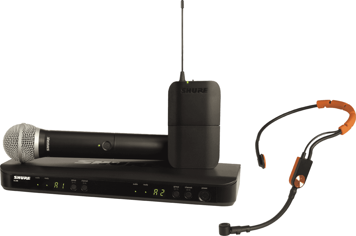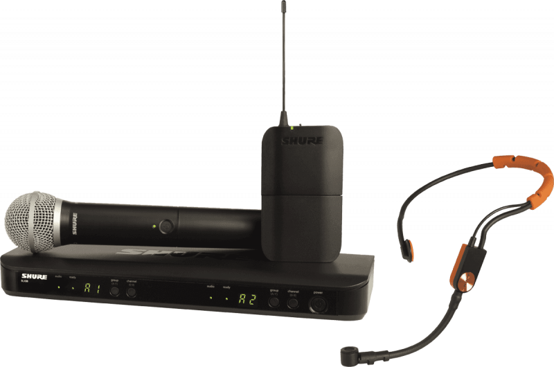 Composé d'un récepteur double BLX88E, d'un émetteur main capsule SM58, d'un émetteur ceinture BLX1 et d'un micro serre-tête statique cardioïde hydrophobe SM31FH‑TQG.