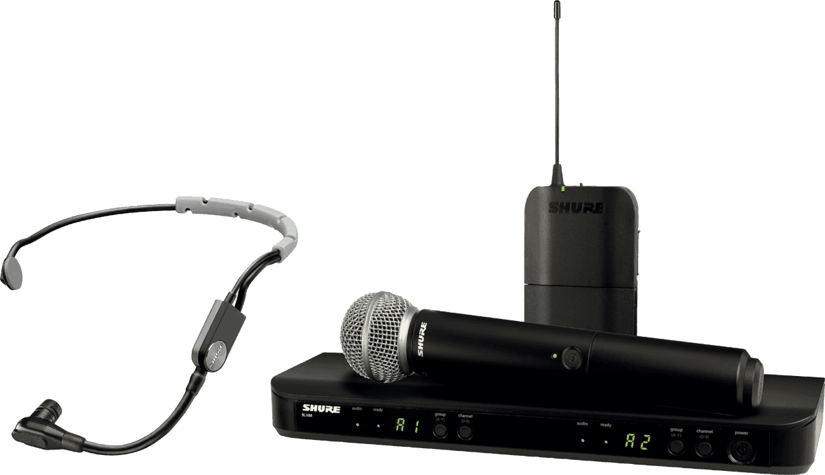Composé d'un récepteur double BLX88E, d'un émetteur main capsule SM58, d'un émetteur ceinture BLX1 et d'un micro serre-tête statique cardioïde SM35‑TQG.