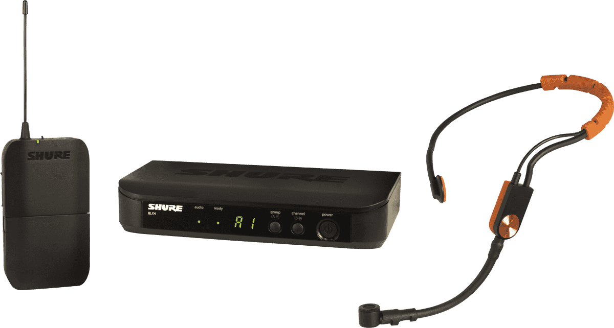 Composé d'un récepteur BLX4E, d'un émetteur ceinture BLX1 et d'un micro serre-tête statique cardioïde hydrophobe SM31FH‑TQG.