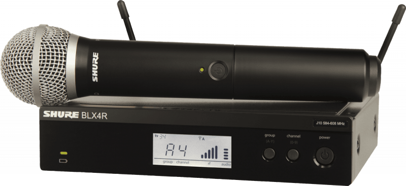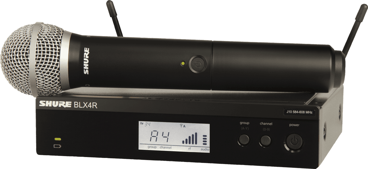 Composé d'un récepteur BLX4RE avec kit de montage en rack simple / double et report d’antennes en façade, d'un émetteur main BLX2 équipé d’une capsule dynamique cardioïde PG58 et d’une pince micro WA371.